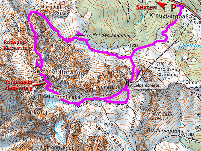 P etliche 100 m nordwestl. vom Kreuzbergpass (Tagesgebühr 18 €! Bus von Innichen, Sexten oder Moos, hält auch an der Kabinenbahn Rotwand) – Arzalpenscharte – Vallone Popera – Lago di Popera – S-Wand-Klettersteig „Mario Zandonella“ (C) – Sextner Rotwand (Croda Rossa di Sesto), Nordgipfel – „Rotwand-Klettersteig“ (A/B) – Wurzbach – Burgstall (Monte Castelliere) – Wege 15B/15A zum Kreuzberg. Oder am „Rotwand-Klettersteig“ weiter zur Rotwandwiese – Sexten/Moos (auch Kabinenbahn).
