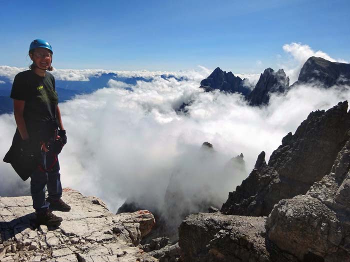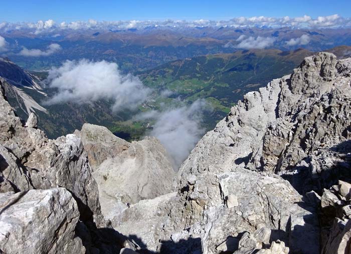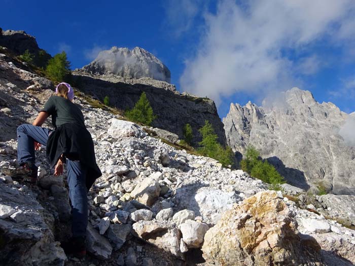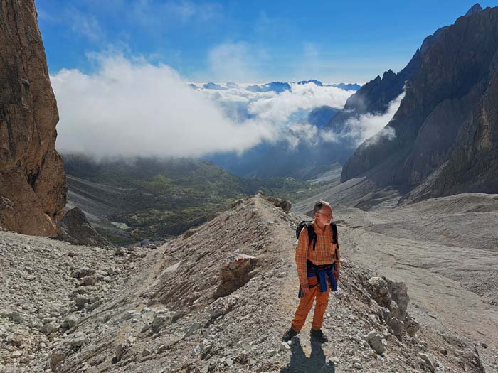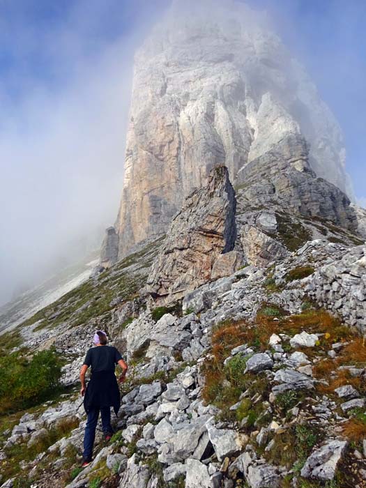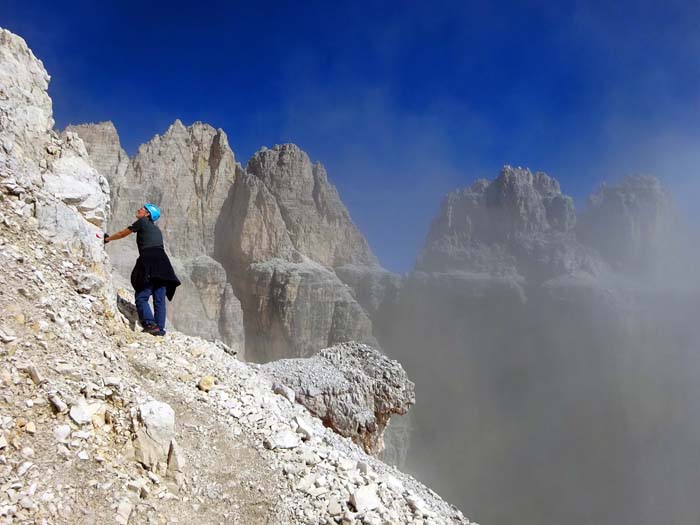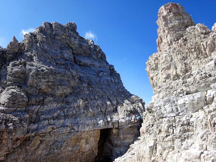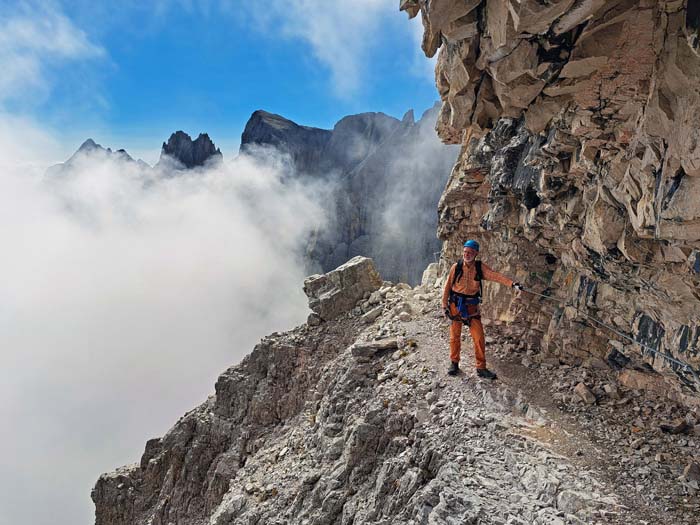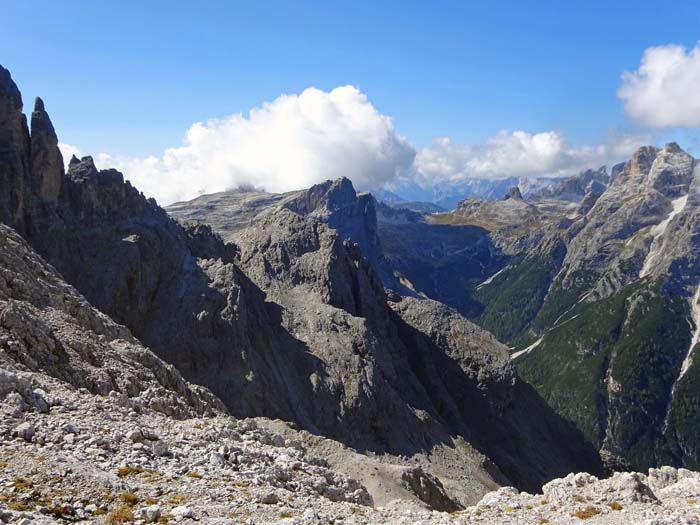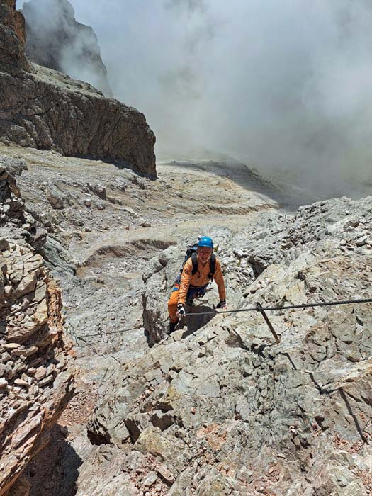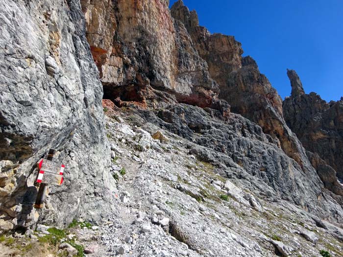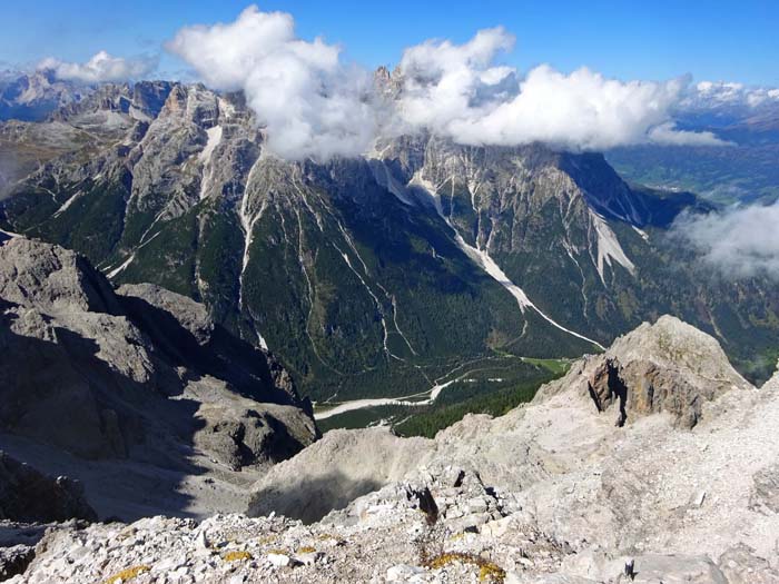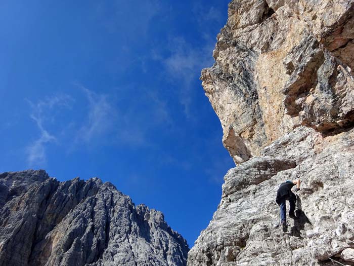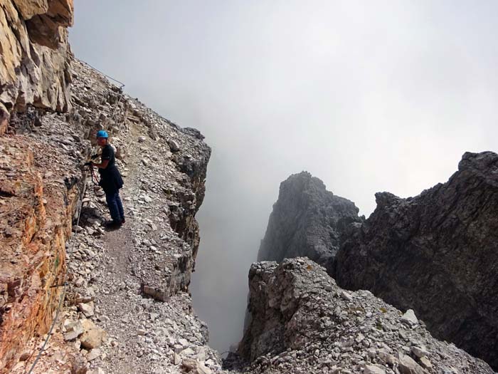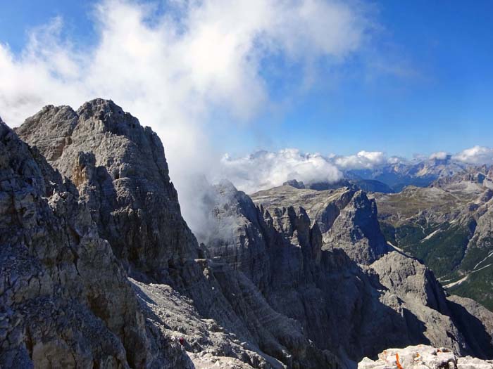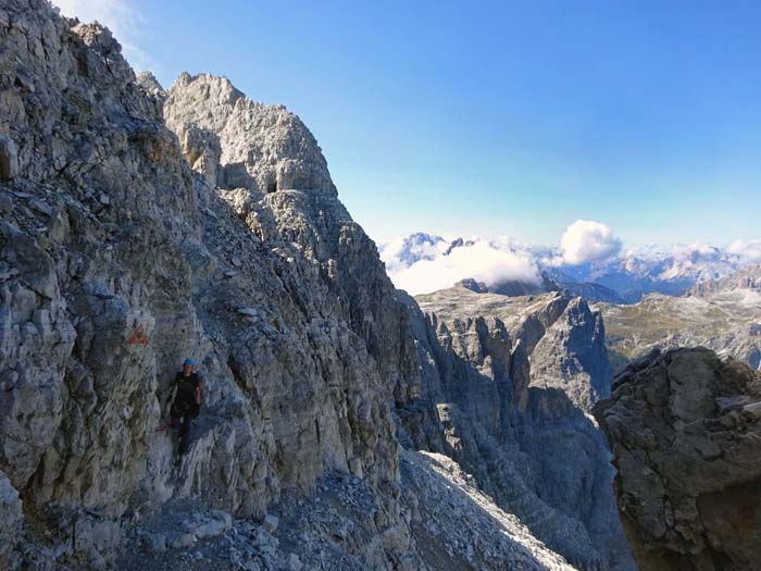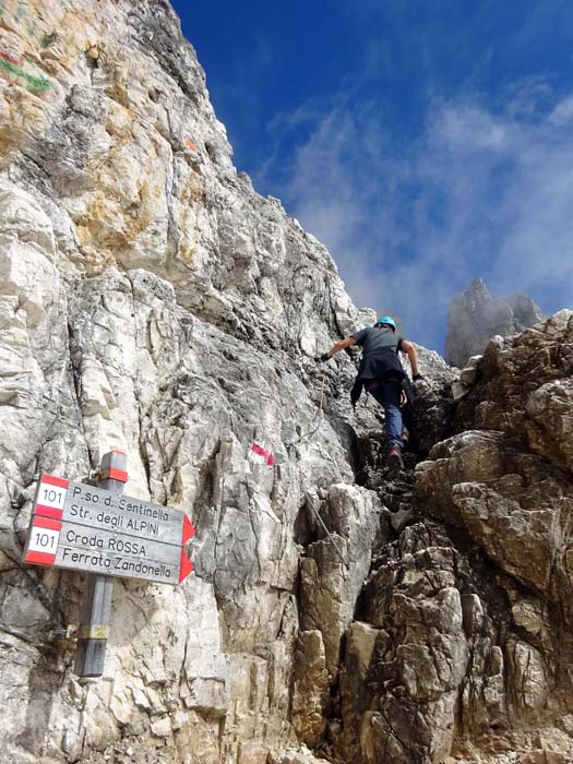 das Rotwandmassiv von NO (Kreuzbergpass); wir erreichen den Gipfel von der Südseite (aus dem Vallone Popera hinter dem linken Grat, bereits Venetien zugehörig) und steigen über den rechten Grat (Rotwand-Klettersteig) zurück ins Südtirolerische auf dem Weg zur Arzalpenscharte (oberhalb Ullis Kopf), daneben der Neuner, rechts hinten die Nordwände der Rotwand und ihrer TrabantenArzalpenscharte gegen Neuner; es macht kaum einen Unterschied, ob man von der Scharte weg horizontal hinüberquert oder gleich am bez. Weg ins Vallone Popera absteigt, letzterer Weg ist besser begehbarjenseits des Tals (von links) Cima Popera, Hochbrunner Schneid und Elferrechts daneben die Sentinellascharte, links unten der Lago di Popera ...... mit Blick zur Cima Bagni im SSOder See gegen Westen - der weitere Anstieg über den Schuttstrom in Richtung Sentinellascharteim Norden flankiert der zerrissene Verbindungsgrat von der Rotwand zum Neuner unseren Aufstieg; wilde Felsgestalten wie Torre Pellegrini, Papernturm und Papernkofel (Gobba Grande di Popera)Rückblick ins Tal zum Rifugio BertiAufstieg am Moränenscheitel des ehemaligen Gletschers, ...... dessen kümmerliche Reste großteils von Schutt bedeckt sindüber uns rechts die Südwand unseres Berges mit dem Zandonella-Klettersteig; der beginnt rechts der Bildmitte unter der gelben Wand; am Fuß der am weitesten herabreichenden Felsen links ...... gibt es bereits eine kurze versicherte Rinne zu überwindenerst oben am Wandfuß wird es dann ernst: rechts hinüber zu den höhlenartigen Bändernan einer roten Kante beginnen die StahlseileTafel am Einstiegam Beginn verbindet die Ferrata ...... in leichtem Zickzack die wenigen Schwachstellen ...... in den teilweise überhängenden Grundmauernan den steilsten Stellen helfen Leitern hinauf in die oberen Wandteile, ...... wo eine Reihe von Bändern, ...... welche meist im 1. Weltkrieg aus dem Fels geschlagen wurden, ...... rechts hinüber in Gipfelfalllinie führenhinter der letzten Kante ...... folgt dann die Ausstiegsrinne ...... in die Scharte am Gipfelgrat; links zum höheren Klettergipfel, rechts geht's weiter ...... am markierten Steig zum Nordgipfel mit dem KreuzGipfelblick gegen Westen; links der Hauptgipfel, daran anschließend das Plateau um die Drei Zinnen HütteSchusterplatte und Dreischusterspitze verbergen sich leider hinter den Wolkenschleiernunsere Abstiegsrichtung: Blick auf Rotwandwiese und Sexten/Moosim SO wieder die Cima Bagniwir verlassen den stolzen Gipfel hinten herum am bez. Weg; überall Stellungsreste aus dem 1. Weltkriegder Rotwand-Klettersteig, den wir für den Abstieg wählen, nutzt die gestuften Felsbauten gegen Nordwestensteilere versicherte Abschnitte wechseln mit kleineren PlateausRückblick auf den burgartigen Gipfelaufbauim Süden der Elfer, links der Mitte schneidet die Sentinellascharte einwildere Grataufbauten werden auf schönen Bändern umgangen; vorne der Wurzbach, welchen der Steig rechts umgehtwir peilen den Einschnitt am kleinen Felsvorbau links unten an; erst dort werden wir den Riesensporn nach Norden verlassenTiefblick gegen den Kreuzbergpass knapp oberhalb der Bildmitteam vorhin erwähnten Einschnitt, der leicht zu übersehen ist, ...... zwängt man sich durch ein enges Schartl ...... in die schattige Nordseite hinüber, wo es ein letztes Mal an den Seilen ...... hinunter zum Burgstall gehthier stoßen wir auf den Wanderweg zurück zum Kreuzberg