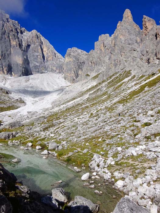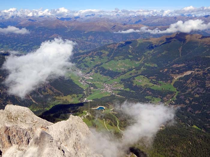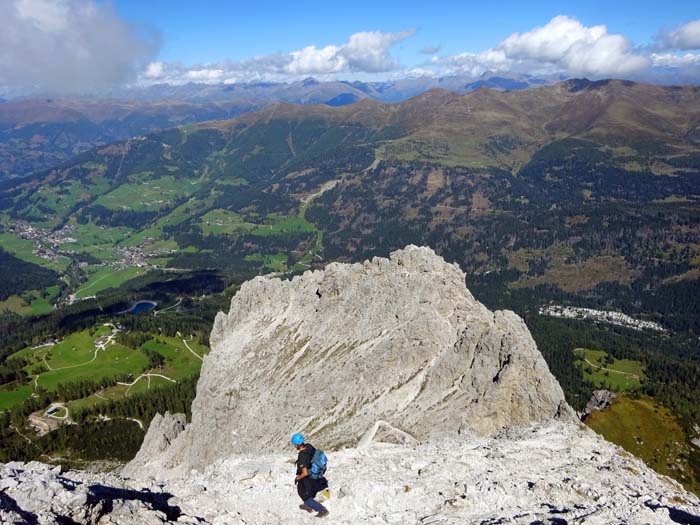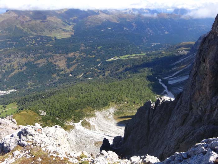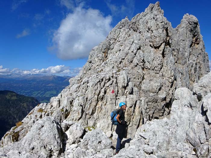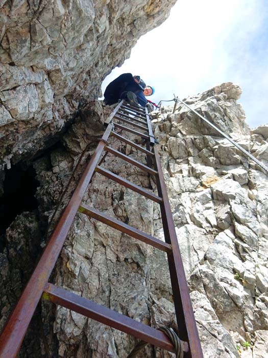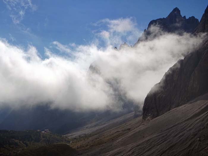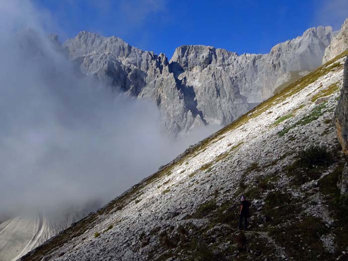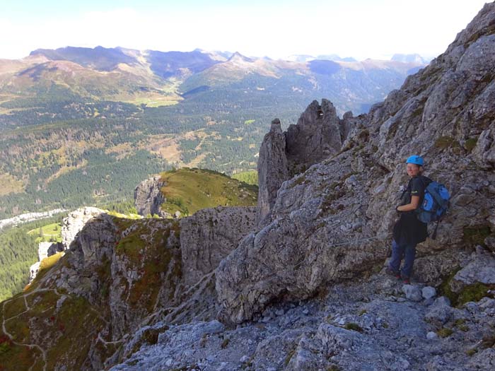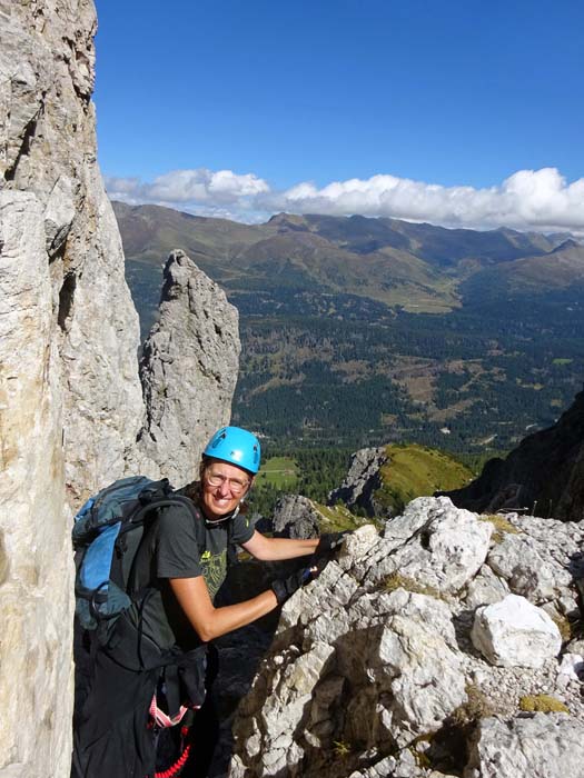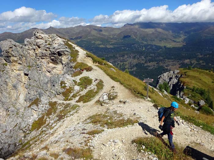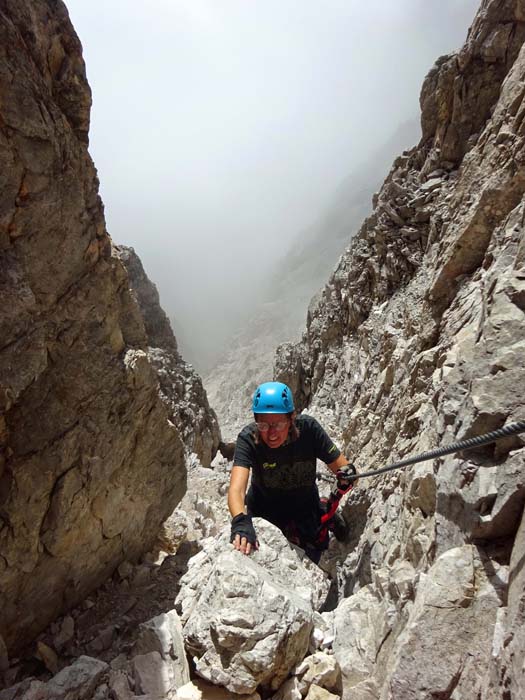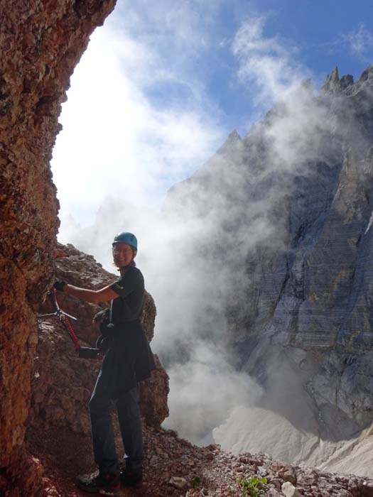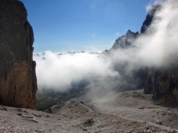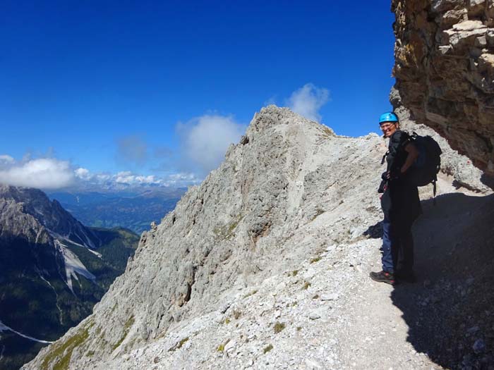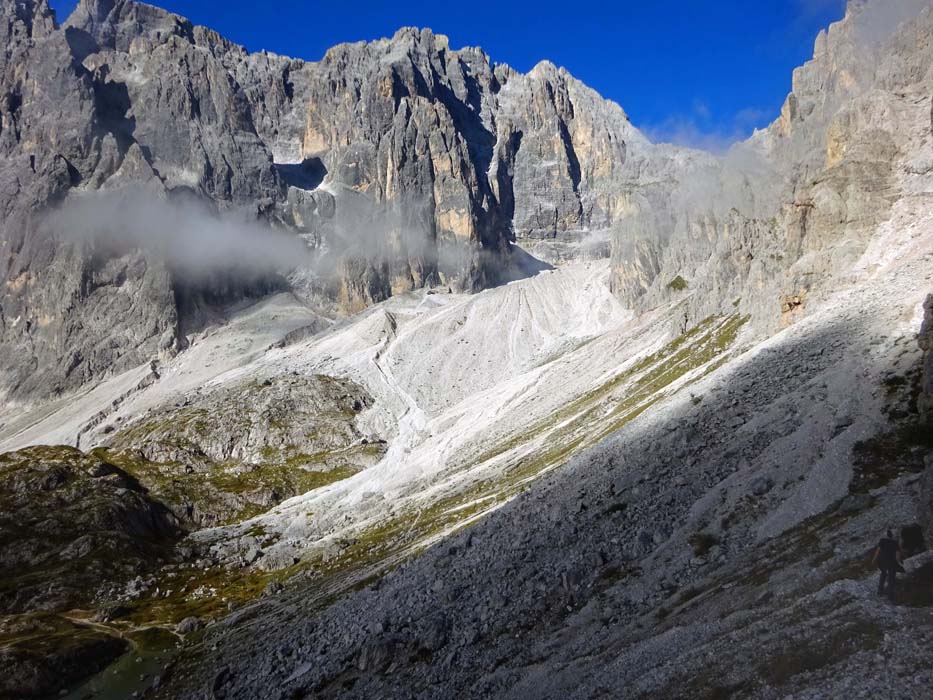 das Rotwandmassiv von NO (Kreuzbergpass); wir erreichen den Gipfel von der Südseite (aus dem Vallone Popera hinter dem linken Grat, bereits Venetien zugehörig) und steigen über den rechten Grat (Rotwand-Klettersteig) zurück ins Südtirolerische auf dem Weg zur Arzalpenscharte (oberhalb Ullis Kopf), daneben der Neuner, rechts hinten die Nordwände der Rotwand und ihrer TrabantenArzalpenscharte gegen Neuner; es macht kaum einen Unterschied, ob man von der Scharte weg horizontal hinüberquert oder gleich am bez. Weg ins Vallone Popera absteigt, letzterer Weg ist besser begehbarjenseits des Tals (von links) Cima Popera, Hochbrunner Schneid und Elferrechts daneben die Sentinellascharte, links unten der Lago di Popera ...... mit Blick zur Cima Bagni im SSOder See gegen Westen - der weitere Anstieg über den Schuttstrom in Richtung Sentinellascharteim Norden flankiert der zerrissene Verbindungsgrat von der Rotwand zum Neuner unseren Aufstieg; wilde Felsgestalten wie Torre Pellegrini, Papernturm und Papernkofel (Gobba Grande di Popera)Rückblick ins Tal zum Rifugio BertiAufstieg am Moränenscheitel des ehemaligen Gletschers, ...... dessen kümmerliche Reste großteils von Schutt bedeckt sindüber uns rechts die Südwand unseres Berges mit dem Zandonella-Klettersteig; der beginnt rechts der Bildmitte unter der gelben Wand; am Fuß der am weitesten herabreichenden Felsen links ...... gibt es bereits eine kurze versicherte Rinne zu überwindenerst oben am Wandfuß wird es dann ernst: rechts hinüber zu den höhlenartigen Bändernan einer roten Kante beginnen die StahlseileTafel am Einstiegam Beginn verbindet die Ferrata ...... in leichtem Zickzack die wenigen Schwachstellen ...... in den teilweise überhängenden Grundmauernan den steilsten Stellen helfen Leitern hinauf in die oberen Wandteile, ...... wo eine Reihe von Bändern, ...... welche meist im 1. Weltkrieg aus dem Fels geschlagen wurden, ...... rechts hinüber in Gipfelfalllinie führenhinter der letzten Kante ...... folgt dann die Ausstiegsrinne ...... in die Scharte am Gipfelgrat; links zum höheren Klettergipfel, rechts geht's weiter ...... am markierten Steig zum Nordgipfel mit dem KreuzGipfelblick gegen Westen; links der Hauptgipfel, daran anschließend das Plateau um die Drei Zinnen HütteSchusterplatte und Dreischusterspitze verbergen sich leider hinter den Wolkenschleiernunsere Abstiegsrichtung: Blick auf Rotwandwiese und Sexten/Moosim SO wieder die Cima Bagniwir verlassen den stolzen Gipfel hinten herum am bez. Weg; überall Stellungsreste aus dem 1. Weltkriegder Rotwand-Klettersteig, den wir für den Abstieg wählen, nutzt die gestuften Felsbauten gegen Nordwestensteilere versicherte Abschnitte wechseln mit kleineren PlateausRückblick auf den burgartigen Gipfelaufbauim Süden der Elfer, links der Mitte schneidet die Sentinellascharte einwildere Grataufbauten werden auf schönen Bändern umgangen; vorne der Wurzbach, welchen der Steig rechts umgehtwir peilen den Einschnitt am kleinen Felsvorbau links unten an; erst dort werden wir den Riesensporn nach Norden verlassenTiefblick gegen den Kreuzbergpass knapp oberhalb der Bildmitteam vorhin erwähnten Einschnitt, der leicht zu übersehen ist, ...... zwängt man sich durch ein enges Schartl ...... in die schattige Nordseite hinüber, wo es ein letztes Mal an den Seilen ...... hinunter zum Burgstall gehthier stoßen wir auf den Wanderweg zurück zum Kreuzberg