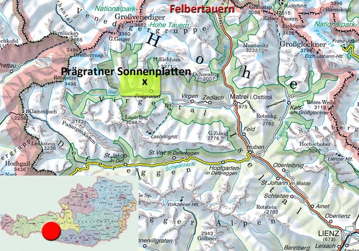 ÜbersichtKarteVorderer Sajatkopf mit Prägratner Sonnenplatten (links der Bildmitte) vom Ortsteil Bichl