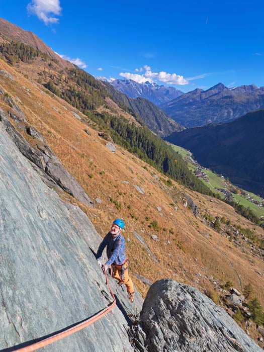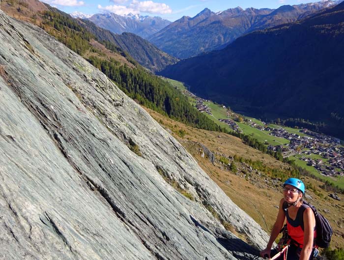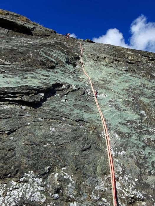 An den talnahen Urgesteinsplatten in der Südflanke des Vorderen Sajatkopf, auch bekannt unter „Dorfmähder“, kann man den Großteil des Jahres über die Reibung seiner Sohlen erproben. Umringt von stattlichen Bergriesen wie Hochschober oder Lasörling stehen eine ganze Reihe vergnüglicher, gut abgesicherter Touren im mittleren Schwierigkeitsbereich zur Auswahl, welche auch spielerisch miteinander kombiniert werden können. Bei unserem Antrittsbesuch sind wir in die Kälberloch (6/6- A0) eingestiegen und vom ersten Stand weg in der Streif (7-/6 A0) weitergeturnt – eine lange Folge von angenehmen Überraschungen.