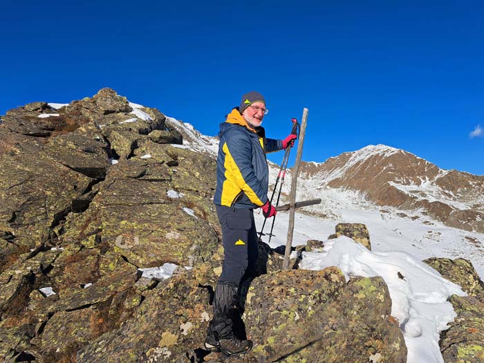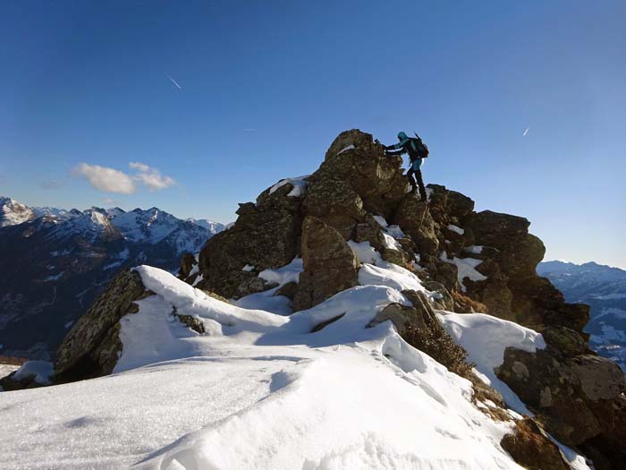 Der Kugelkopf ist besonders in schneearmen Wintern, wo die Tourenschi besser zu Hause bleiben, eine lohnende Unternehmung, die trotz der relativ geringen Höhe ein gesundes Maß an Umsicht erfordert. Das eingeschneite Gelände oberhalb der Viehalm ist nicht nach jedermanns Geschmack - technisch zwar nicht schwierig, mit seinen verborgenen Löchern zwischen eingeschneiten Felsen und niedrigem Bewuchs ist aber trittsicheres, behutsames Steigen gefragt. Auf der Gratüberschreitung vom Vorgipfel (großer Steinmann) über den Hauptgipfel hinweg in Richtung Winkelkopf stellenweise leichte Kletterei (I-II). Wundert Euch nicht über die unterschiedlichen Schneelagen - die folgenden Bilder sind die Ausbeute dreier Begehungen bei diversen Schnee- und Wetterlage im Zeitraum zwischen 2023 und 2026.
