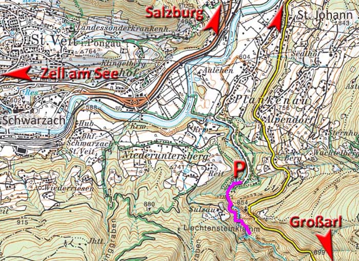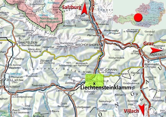 P Liechtensteinklamm, 4 km südl. von St. Johann - Klammsteiganlage mit 440 Treppenstufen und höhlenartigen Durchgängen. Aktuell (2025) 15 €/Erwachsene und 8,50 €/Jugendliche bis 18, Kinder bis 6 frei.