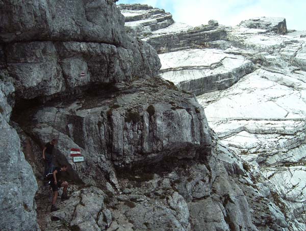 am Grieskarsteig, kurz unterhalb des Urban-Bandes; dahinter die fantastischen Platten der Zwölfer-Ostwand mit der klassischen Genusskletterei „Ulli, da Tanzbodn is insa!“eine kurze Eisenleiter hilft aufs Urban-Bandauf dem Weg über den Abblasbühel zur Pühringer Hütte; ein willkommener Kontrast nach stundenlangem Anstieg zwischen steilen FelswändenUlli und Christian kurz vor dem Zielder Elmsee mit Pühringer Hütte und Rotgschirr