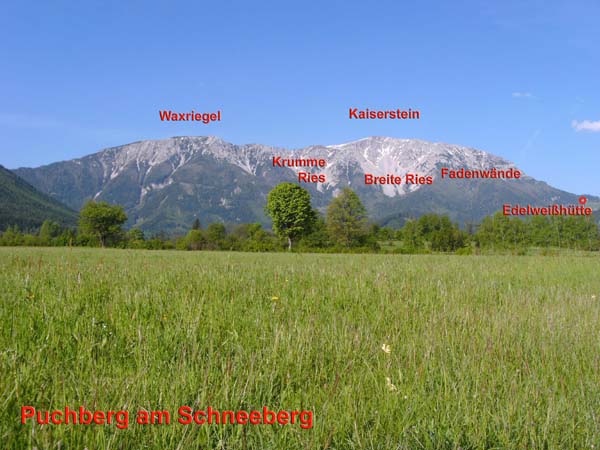 P Fadenwiese, Losenheim, 6 km westl. Puchberg am Schneeberg - Edelweißhütte - Sparbacherhütte - Fadenweg - Almgatterl - Kientalerhütte - Klettersteig Turmstein (C) - Südlicher und Nördlicher Grafensteig - Bürklehütte - Edelweißhütte (oder Weningersteig) - P.