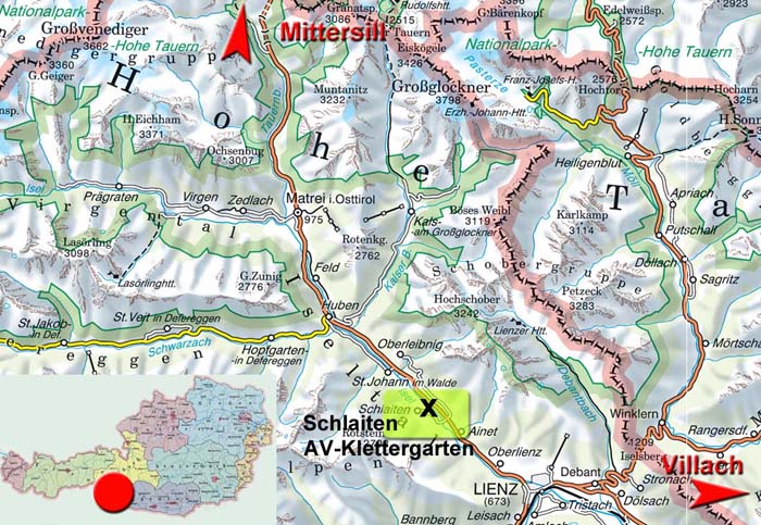 P auf der Westseite der Schlaitner Brücke über die Isel (gut 1 km nw. von Ainet, 8 km nw. von Lienz) – Forststraße direkt am Flussufer (Teilstück des Iseltrails) 1,5 km gegen Nordwest, der Klettergarten liegt wenige Schritte links des Weges. Eine Zufahrt auf teils unbefestigten Wegen über Schlaiten/Mesnerweg ist umständlich und wird nicht gerne gesehen.