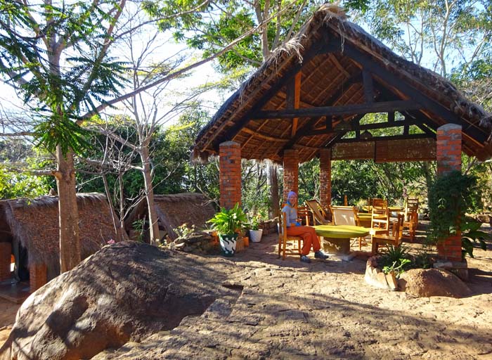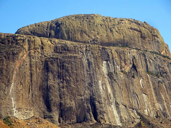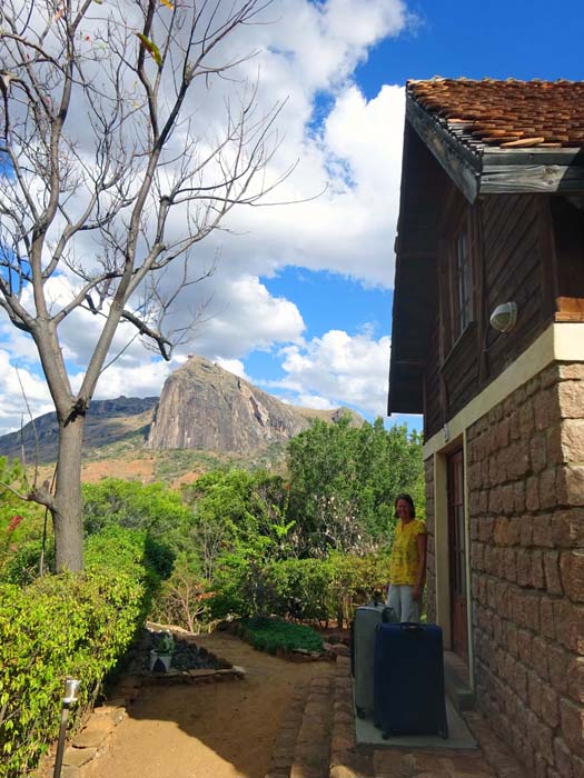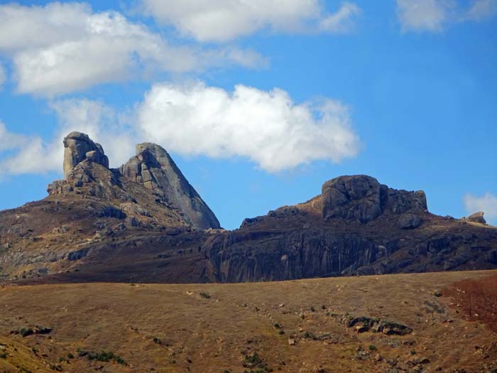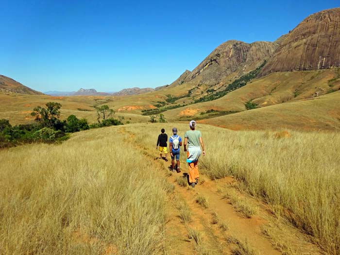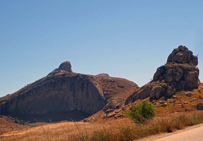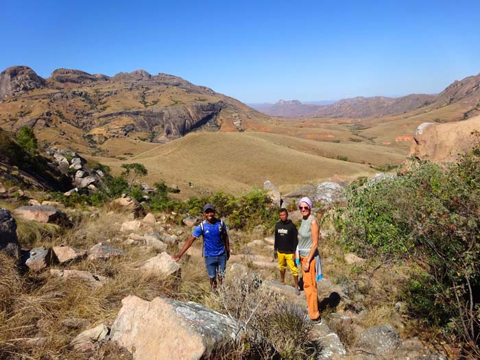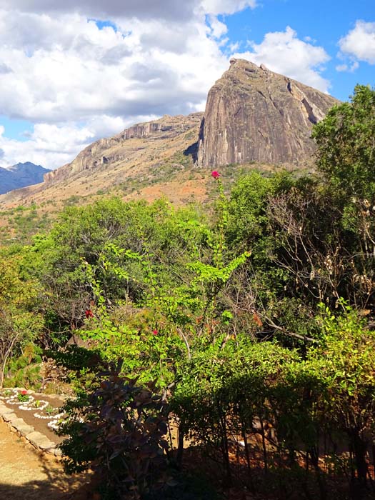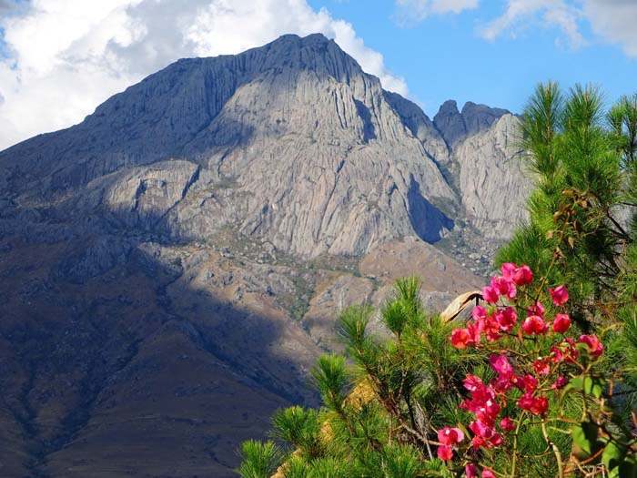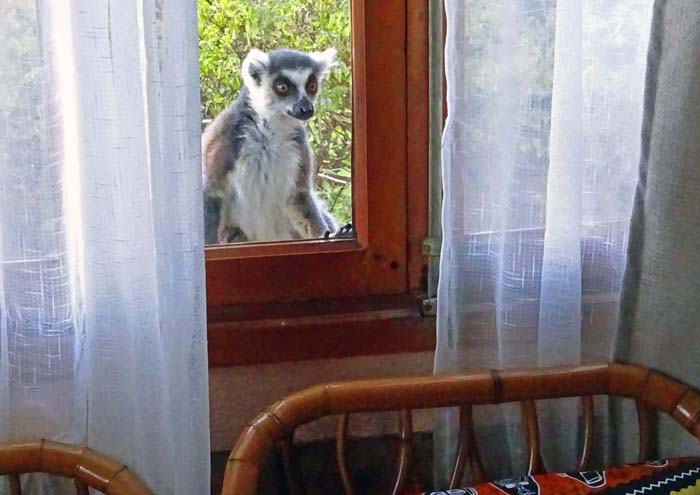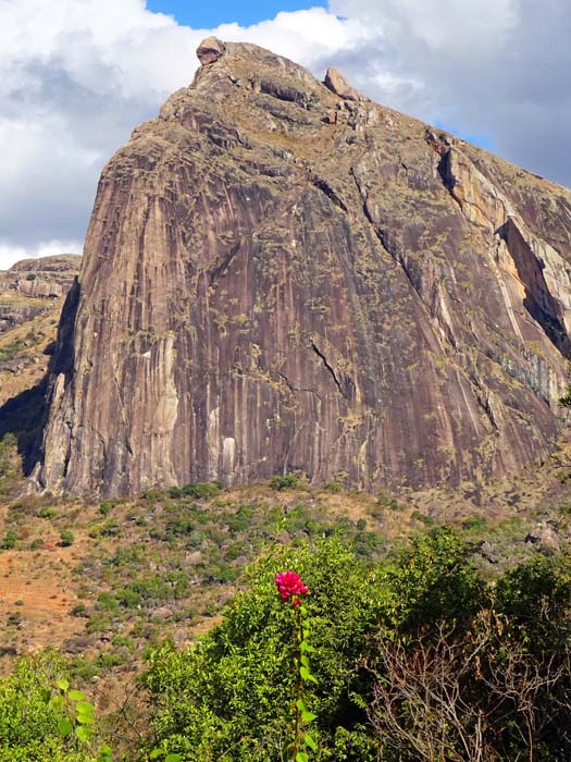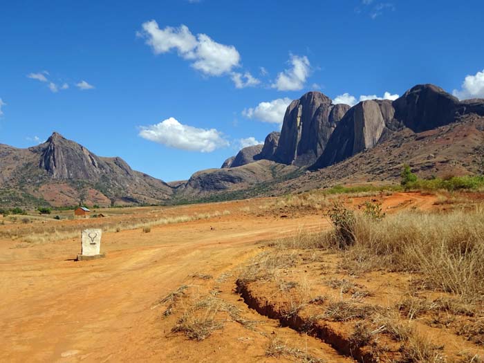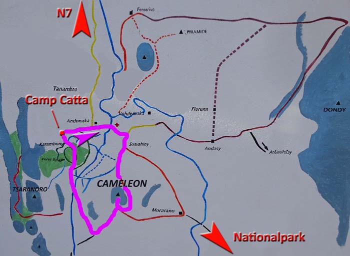Vom Isalo-Nationalpark fahren wir die N7 über Ihosy (sprich: i-jusch) weiter gegen Nordosten und erreichen schließlich auf einer 30 km langen, ziemlich schlechten Piste über Vohitsaoka das kleine Dorf Andonaka. Das gastliche Camp Catta liegt etwas erhöht gleich dahinter und beherbergt uns wieder einmal in den typischen Bungalows, wo es an Haustieren nicht mangelt – einer charmant-frechen Affenbande von Ringtails (Kattas). Obwohl der unwiderstehliche Blickfang der Tsaranoro-Wände wie auch unser Caméléon und das Camp selbst außerhalb des Nationalparks liegen, ist auch hier für alle Unternehmungen, die über einen Spaziergang hinausgehen, ein Führer („eigentlich“) obligatorisch.