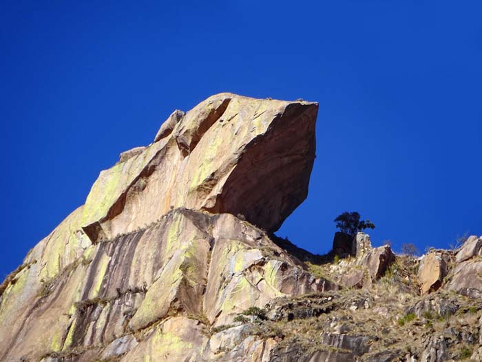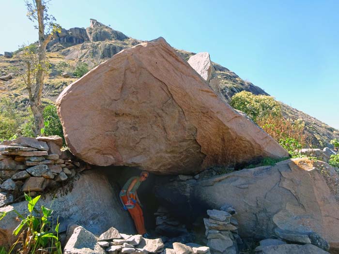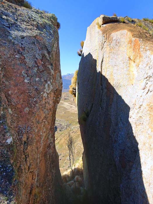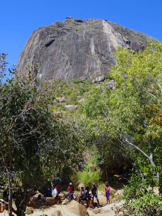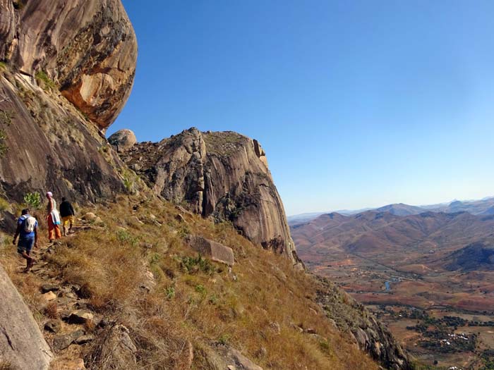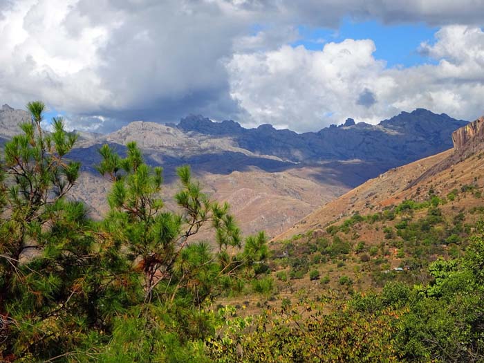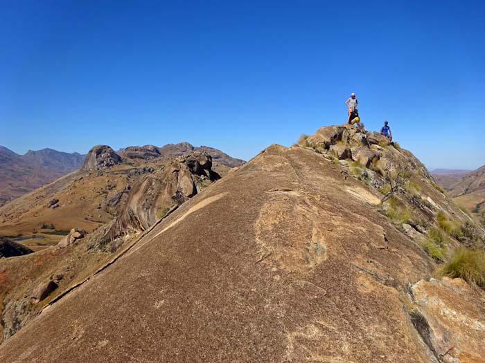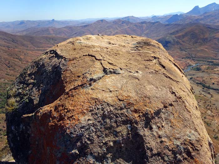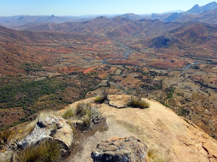 zu Beginn ein paar Eindrücke von der Fahrt zwischen Isalo- und Andringitra-Nationalpark: Markttag auf der großen Ebene östlich von Ranohiraimmer weiter schraubt sich die N7 hinauf ins Hochland; im nächsten Talkessel das Städtchen Ihosy (sprich: i-jusch)reger Betrieb in den Straßen von Ihosyunser Fahrer-Freund Adolphe nutzt die Gelegenheit, den von der letzten Woche auf den wilden Pisten des Südwestens in Mitleidenschaft gezogenen Luftfilter zu reinigendirekt neben der Nationalstraße: völlig unerschlossene Gipfel, hier der Ifandana, ...... dessen Ostwand sofort den Blick jedes Kletterers magisch anzieht; Aspiranten müssten sich auf ein Freilager einstellen, da es zurzeit noch weit und breit keine adäquate Unterkunftsmöglichkeit gibtdie Landschaft wird immer abwechslungsreicher, ...... die Gipfel immer einladenderein Stück hinter Ankaramena verlassen wir die N7 und kurven auf einer abenteuerlichen Piste ...... unserem Tagesziel entgegen: dem Andringitra-Gebirge; morgen geht's aufs Caméléon (links), übermorgen in die großartige Tsaranoro-Kette, das Camp Catta liegt in der Senke dazwischenin den bis zu 800 m hohen Wänden des Tsaranoro und seiner Trabanten gibt es bislang gut drei Dutzend gebohrte Kletterrouten zwischen 5c und 8b mit maximal 20 Seillängendas gemütliche Camp Catta ist auch für einen längere Aufenthalt bestens geeignet, ...... wir sind in einem kleinen Häuschen mit eigenem Oberstock für Ronja untergebrachtvom Eingang sehen wir direkt aufs Caméléon hinüber, das wir morgen von links nach rechts überschreiten werdenRonjas Reich im Oberstockauch ein Schwimmteich steht zur Verfügung ...... mit Blick auf die gegenüberliegende Talseite mit dem beherrschenden Dondy, an dem ebenfalls mehrere Kletterrouten mit bis zu 23 Seillängen wartenbald machen wir mit einer herzigen Affenbande Bekanntschaft, welche die Neugierde ...... schon nach kurzer Zeit vor unsere Fenster treibtist das für mich?schade! - Mal hinten vorbeischleichen und schaun, ...... ob's drinnen was zu futtern gibt!der Katta verdrückt eine Banane nach der anderen, ...... aber ins Bett kommt er uns nicht!das Fressgelage spricht sich in Windeseile herum und in Kürze ...... sind wir umzingelt von RingschwanzlemurenRundblick von der Eingangstür unseres Häuschens: der Dondy, 2195m, ist der höchste Kletterberg auf der anderen Talseitegleich rechts davon zieht das Tal weiter hinein in Richtung Nationalpark - alpines Potential ohne Endenoch weiter rechts unser Ziel für nächsten Tag mit Nordkante und Nordwestwand; das Camp Catta liegt in einem Ausläufer des „Heiligen Waldes“bergseitig überm Camp zum Greifen nahe die Tsaranorowände, hier bei Sonnenaufgangnach dem Frühstück steigen wir kurz hinab nach Andonaka und in wenigen Minuten zum nächsten Weiler: Soavahiny an der Nordostseite des Caméléon; den Aufstieg nehmen wir über die mäßig geneigte Flanke in den Ostsattel und weiter über den Südgrat zum Gipfeldie Dorfschönen lassen sich gern ablichten und bestaunen sich begeistert auf den Bildernunser junger Führer (hinten in Blau), der hervorragend Englisch spricht, hat einen Lehrling mitgebracht; die Nationalparkranger Madagaskars verstehen es, ihr erstaunlich gutes Wissen gekonnt weiterzuvermittelnChamäleon am Aufstieg ...... und sein steinerner großer Bruder hoch über unsrechts die Nordkante, links der Südgrat; den Gipfelblock bildet tatsächlich ein gewaltiger Steinquader ...... in Form eines Chamäleons, der Kopf ist durch eine Kluft vom Rumpf getrenntvom höchsten Punkt links außerhalb des Bildrandes kann man an einer geneigten Kante zur tiefen Scharte abklettern und anschließend mit Sprung die Spitze der runden Felskugel am Kopf erreichenim oberen Teil steilt die Flanke etwas auf, ...... dann ist der Ostsattel erreicht; der Lehrling ist in Flip-Flops unterwegs, Turnschuhe sind erst als ausgebildeter Führer leistbarvom Sattel entlang einer Felswand hinüber ...... auf den Südkamm und über ihn ...... zum Gipfel des CaméléonGipfelblick gegen Westen: ganz links der Mitsinjoarivo, durchs enge Kar daneben werden wir morgen ansteigen, dann Gr. und Kl. Tsaranoro, Karambony und hinten rechts die Lemur Wall; in diesen Wänden gibt es zurzeit etwa drei Dutzend Routenum auf den Kopf des Chamäleons zu gelangen steigt man am flachen Felsrücken einige Meter bis zum Abbruch weiter, ...... dann klettert man an der rechten Kante in die Scharte des Kragenspalts ab; links einige Meter empor und über eine Sprungstelle ...... auf die runde Felskugel am Kopf des Caméléondie Kopfkugel vom höchsten Punkt gesehenhinter der Kugel kann man noch ein Stück in Richtung Nasenspitze runterBlick vom Kopf hinüber zum Gipfel; den Abstieg nehmen wir rechts hinunter ...... ins Land der Bara, dem als Viehdiebweltmeister bekannten Nachbarstamm der Betsileo - siehe die Kindheitserlebnisse von Emmanuel im Textbeim Abstieg passieren wir einen Viehpferch für die Zebus der Betsileo ...... mit angeschlossener Hirtenunterkunft, ...... welche auch heute noch in Verwendung istetwas weiter unten der breite Grenzsattel zwischen den Stammesgebieten, wo wir einen scharfen Haken nach rechts schlagen, ...... um unter den Westwänden unseres Berges wieder zum Camp zurückzugelangenauf der anderen Talseite die 450 m hohen Wände des Karambony (5 Routen zwischen 6a und 7b+)an einem Pool am Rand des Heiligen Waldes ...... findet soeben ein Ausbildungslehrgang für künftige Nationalpark-Ranger stattein französisches Kletterpärchen im Nordpfeiler (7a) des Caméléonunter einem Felsblock am Wegesrand ...... haben die Betsileo zur makabren Abschreckung vor weiteren Überfällen zwei Schädel der räuberischen Bara zur Schau gestellt. Die Botschaft: Das passiert, wenn ihr's noch einmal versucht!zwei Wegebauer beim Knochenjob mit einem primitiven Handbohrmeissel; darüber der Gr. Tsaranorokurz darauf betreten wir den „Heiligen Wald“ - das Camp ist nicht mehr weitauf einer kleinen Lichtung fertigt ein alter Mann Tag