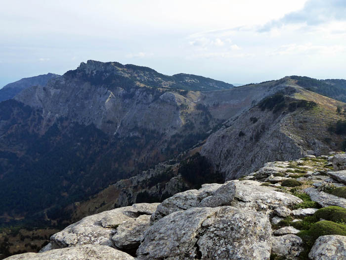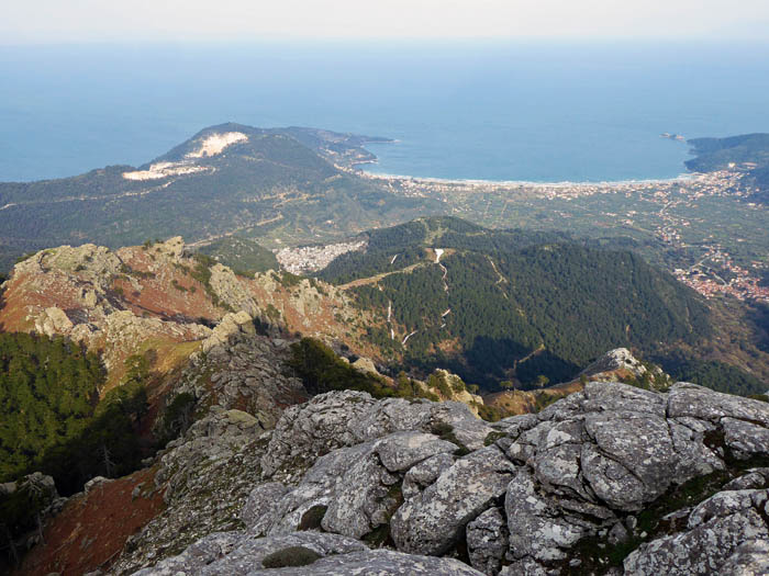 Abwechslungsreiche Unternehmung für Leute, die das Strandleben satt haben. Die eigentliche alpine Überraschung wartet erst am Ende - am Gipfel des Profitis Ilías: Der in der Karte verzeichnete Steig über die Ostkante existiert nicht, sie bricht vielmehr etwa 30 Hm unterhalb des Gipfels pfeilerartig zum Sattel ab. Bei Unkenntnis des Geländes sieht man sich gezwungen, gegen Norden zur Waldgrenze abzusteigen - auch dabei eher links, gegen NW halten, sonst gerät man in plattiges Geschröf im gesunden 3er-Bereich. Sobald man den Waldboden erreicht hat, führt ein schmaler Steig mit roten Punkten horizontal hinüber zum schulterartigen Ostsattel und hinunter zu den Forstwegen. Ein nachmittäglicher Aufbruch empfiehlt sich wegen der unübersichtlichen Situation am Profitis Ilías selbst für konditionsgesegnete Ridge-runner höchstens für den direkten Weg zum Ypsárion und zurück ins Tal, allzu leicht wird sonst der Berglauf zum Wettlauf mit der Zeit.