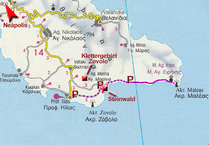 P am Steinwald hinter der Kapelle Ághia Marina, etwa 7 km sö. von Ághios Nikólaos, knapp 20 km von Neápolis; oder noch 4 km auf der schlechten Piste weiter bis zu deren Ende - Küstensteig zum verlassenen Kloster Ághia Iríni (hier kann man in einer Klosterzelle übernachten, Schlüssel bei der Kirche in Ághios Nikólaos) - Kapelle am Kap (Fresken); dahinter unübersichtliche Steilwände, das Kap selbst ist nur kletternd zu erreichen. Am selben Weg zurück, Gegenanstiege.