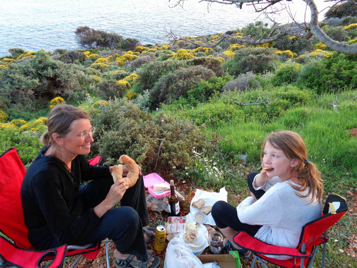 Wer die lange und holprige Zufahrt in Kauf nimmt, stößt schon im Vorfeld auf eine ganze Reihe lohnender Eindrücke, wie etwa die versteinerten Baumstümpfe an der sehr ansprechenden Küste um die Kapelle Ághia Marina. Startet man bereits am kleinen Fischerdorf Profitis Ilías, braucht man seinem Fahrzeug keine ruppigen Pisten zuzumuten, hat aber ein tagesfüllendes Unternehmen vor sich. Vom Steinwald-Geopark läuft man dann noch einmal eine knappe Stunde bis zum Pistenende. In aussichtsreichem Auf und Ab gelangt man dann teils hoch über dem Meer zum eigentlichen Ziel, dem verlassenen, aber gut in Schuss gehaltenen Kloster Ághia Iríni. Romantische Genießer holen sich schon bei der Zufahrt von der Kirche in Ághios Nikólaos den Schlüssel für eine der sechs Klosterzellen und übernachten an diesem weltfernen Ort. Die kleine Kirche ist unversperrt, sogar ein frei stehender Backofen ist vorhanden. Hinterm Kloster führt noch ein schmaler Pfad einige Hundert Meter weiter bis hinaus über die Felsen, eine kurze eingehauste Wendeltreppe leitet hinunter auf eine kleine Terrasse vor einer offenen Kapelle mit erstaunlich gut erhaltenen Fresken. Noch weiter geht's nur über Kletterstellen bis zum 2. Grad steil bergab zum Meer. Das richtige Kap ist nicht klar auszumachen, in jedem Fall fühlt man sich am Ende der Welt, allein mit Felswänden und dem Meer.
