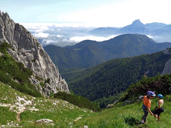Mit Seilbahnbenützung eine gemütliche, aber spannende Halbtagsunternehmung am Nordostrand des Höllengebirges. Am unangenehmsten ist bei Nässe der Abstieg vom Hochflächenrand über grasige Schrofen zum Einstieg. Gebohrte Laschen versprechen vielleicht für die Zukunft Seilversicherungen an den neuralgischen Stellen. Liegt noch ein Schneefeld im Kar, braucht man mitunter sogar Steigeisen - dann wird aber vorsichtshalber bereits an der Talstation auf eine Sperre hingewiesen.