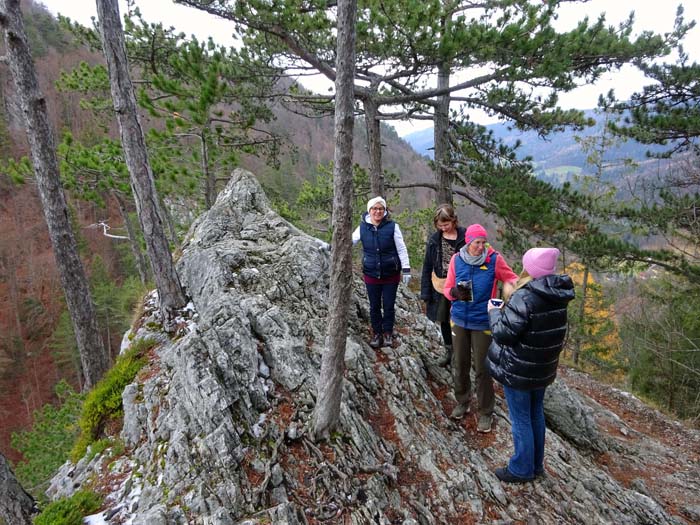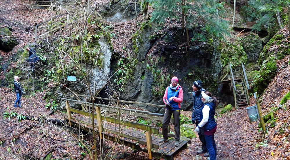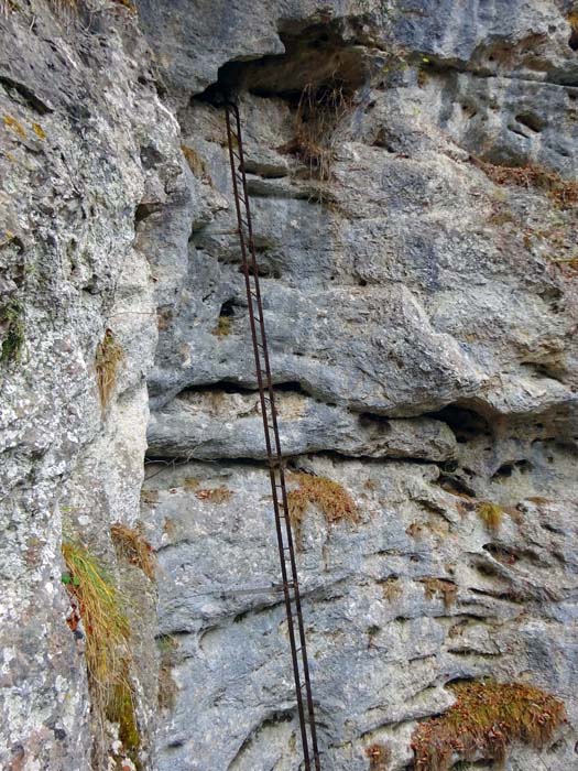 vier Mädels mit drei verschiedenen Nationalitäten am Eingang zur Klammdie Steinwandklamm ist eine der wildesten Karstklammen Niederösterreichs und wurde bereits 1884 touristisch erschlossenim  bunten Wechsel zwischen kleineren Felsstufen und flachen Passagen ...... erreichen wir alsbald die Abzweigung zum Klettersteig; die Jugend schnuppert schon an der ersten Eisenleiter, ...... während die reiferen Semester sich für die Fortsetzung des gut ausgebauten Klammsteigs entscheidender Rudolf-Decker-Steig führt durch die ca. 150 m hohen, von Höhlen durchzogenen Felswände links der Klammder Klettersteig wurde schon 1927 angelegt, Schlüsselstelle ist die fast 20 m hohe, annähernd senkrechte Leiter hinauf ins „Wildschützenloch“; links davon wurde 1983 zur Entschärfung dieser spektakulären Turnübung eine nur halb so hohe Leiter errichtetso eindrucksvoll die frei stehende Sprossenreihe auch erscheinen mag - ...... Ronja und Venla, ihre Freundin von der schwedischen Insel Gotland, müssen nicht lange überlegenaus dieser Höhe erscheint die Ersatzleiter eher schmächtigam Eingang zum Wildschützenloch, ...... welches sich als finstere Durchgangshöhle erweistanschließend durch eine weitere kleine Öffnung entlang der freien Wand schräg abwärts ...... zu einem Felsentor, durch welches die Mädels neuerlich in den Berg schlüpfenüber eine Holztreppe - ähnlich wie unten in der Klamm - gelangen wir in kurzer Zeit ...... zur nächsten Höhle, ...... deren unterirdischer Steilaufschwung mit einer Leiter überwunden wirdkurzer Umtrunk überm Höhlenausgang, Vendla schon wieder unterwegs ...... durch den folgenden Spalt; hernach eine längere, leicht abschüssige Querung hinüber ...... unters „Türkenloch“; während der türkischen Invasion Ende des 17. Jahrhunderts sollen sich hier ...... in dieser großen Durchgangshöhle einheimische Bauern vor den blutrünstigen Muselmanen versteckt habendurch den abziehenden Rauch des Kochfeuers wurden sie jedoch entdeckt und anschließend von der feindlichen Horde getötetim Jahr 1981 brachten archäologische Grabungen Knochen, Tonscherben und Münzen ans Licht, welche Indizien für den Wahrheitsgehalt der Legende sein könntenheute keine Türken in Sichtder Ausstieg aus dem Türkenloch ...... leitet auf einen kleinen Felsgipfel, wo sich die Gruppe wieder vereintmittlerweile schon vier Nationen - Ungarn und Deutschland versorgen Schweden und Österreich mit warmem Tee, Gott sei Dank sind wir hier schon hoch über der „EU-freien Zone“ rund um Franzis Hütte am Klammeingangüber einen kurzen Sporn steigen wir noch wenige Meter hinauf zur kleinen Hochfläche um den Kreuthsattel, wo sich als Fortsetzung mindestens drei weitere attraktive Unternehmungen anbietenmehrere Wegvarianten führen weit ausholend unter den etwas abgelegenen Gipfel der Steinwand, welcher etwa 1,5 km Luftlinie nördlich der Klamm mit bis zu 100 m hohen Wänden in einen Seitenast des abgeschiedenen Ebeltals abstürztauf den Gipfel selbst führt kein bezeichneter Weg, zuletzt erreicht man über eine große Wiesenfläche ...... den baumbestandenen Gipfel des Felsriffs, welches jedoch freie Aussicht nach Norden auf Geißstein und Hocheck (den östlichsten 1000er der Alpen) bietetden Abstieg nimmt man am schönsten über den langgestreckten Nordostkamm, ...... immer entlang der Kante der Abstürze, von der man jederzeit rechts (östlich) absteigend etwa 100 Hm tiefer wieder einen markierten Weg erreicht; auf ihm übers Gehöft Gruber und den Ruschhof zurück zum Parkplatz
