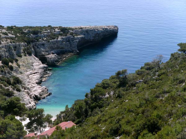 Lustiger Felssporn zwischen vier Buchten an der abgelegenen Nordküste. Unbefestigter Fahrweg vom Sträßchen Vis - Oključna. Wem die Klippenkraxlerei rund um die kleine Halbinsel zu aufwendig ist, der kann sich auch den gut begehbaren Steig durchs Gehölz suchen.