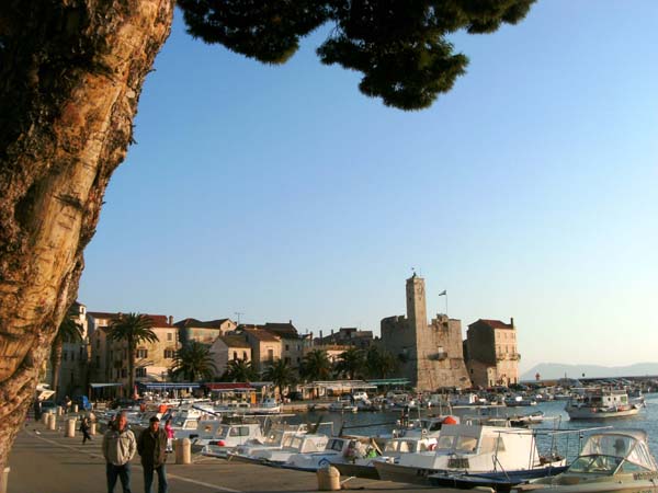 Hauptort der Insel, Fährhafen, spärliche antike Überreste, Franziskanerkloster, nette Hafenpromenade, mehrere Aussichtspunkte und verfallene Wehrtürme über der Bucht.