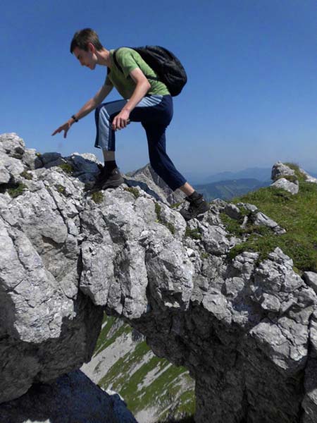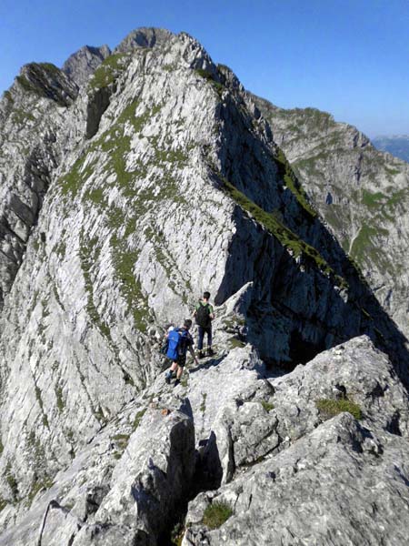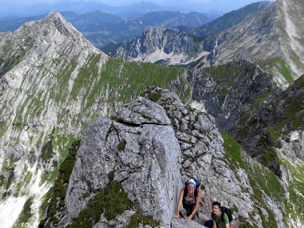 Die Traversierung dieses ungemein fotogenen, elegant geschwungenen Firstes wird trotz seiner alpinen Würze relativ oft unternommen; besonders bei einheimischen und Linzer Bergsteigern hat die Tour so etwas wie Kultstatus. Erich hat sie innerhalb von 40 Jahren sechsmal begangen - und viele Aspiranten schon nach ein paar Hundert Metern umdrehen sehen. Nicht alle Steilaufschwünge lassen sich vermeiden, auch die Umgehungen - oft an schmalen, abdrängenden Bändern über haltloser Tiefe - verlangen viel Erfahrung, zumal hier fast alle seilfrei unterwegs sind. Kurzum, eine Supertour mit leicht herbem Charakter, bei der sich viele Wanderer und Nur-Sportkletterer trotz der heroischen Bewertung im uralten Heß-Pichl-Führer (II-) auf einem gemeinsamen Nenner treffen: nämlich doch lieber die Finger davon zu lassen.