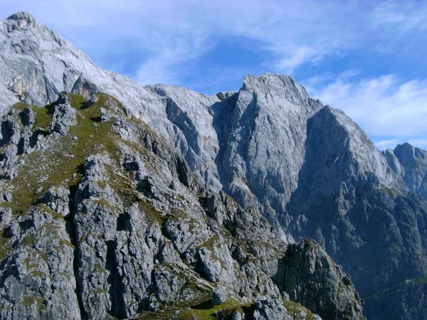 Vom Gipfel gut einzusehen auch die berühmten Kletterrouten der zentralen Hochkönig-Südwand, wie etwa Gloria Patri, Don Juan oder Dientenerweg Albert Prechts.