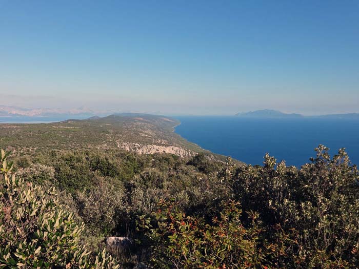 Aufstieg am gemütlichen Nordhang des Borovik; hinter dem Hvarski kanal die Insel BračGipfelblick vom Borovik, 500 m, nach NW; am Ausgang der Vratnik-Schlucht das uralte Dorf Pitve, dessen Wurzeln bis ins 3. Jh. v. Chr. zurückreichender Osten der Insel streckt sich wie eine lange Zunge ins Meer; links Biokovo, rechts die Halbinsel Pelješacim S schließlich die Inseln Šćedro und Korčula25 km weiter sieht man vom Gipfel der Likova glava bereits bis zur Ostspitze der Insel beim Kap Sućuraj