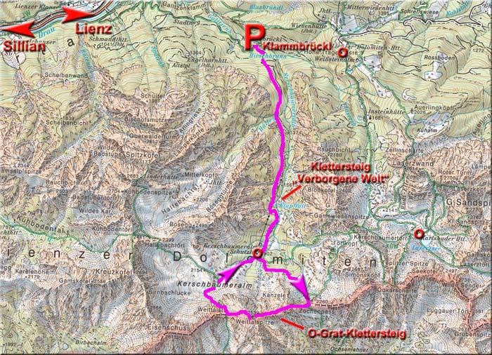 P Klammbrückl (südl. von Lienz, Auffahrt hinter Leisach über den „Stadtweg“ von Mai bis Oktober gestattet, ca. 10 km ab Stadtzentrum) - Kerschbaumertal, event. mit dem Klettersteig „Verborgene Welt“ am Klapffall als Draufgabe (B/C, zwei Stellen C/D, 400 m Stahlseil, 4 Seilbrücken) - Kerschbaumeralm-Schutzhaus - Zochenpass - Ostgrat „Allmaier-Toni-Klettersteig“, B/C - Weittalspitze - Abstieg W-Flanke in den Weittalsattel - „Hans-Falkner-Weg“ auf die Kerschbaumeralm - Schutzhaus - Klammbrückl.