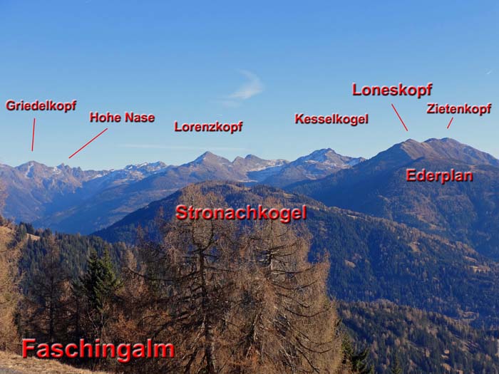 P Kapelle Lindsberg, Auffahrt von Nikolsdorf über Michelsberg, knapp 5 km – längere, etwas lästige Querung über Steige und Ziehwege nach O (zurzeit mangelhaft markiert, etwas Spürsinn gefragt) übers Gehöft Hanser oberhalb Michelsberg zur Forststraße auf den Ploner Berg – Mooswald-Jagdhütte – Luelfeld – Damertörl – SO-Kamm auf den Zietenkopf; oder direkt vom Luelfeld weglos über den S-Sporn – Ü Kohlbrunnkopf – auf dem Steig in der Nordseite ins Michelsberger Törl (direkte Überkletterung des Gratstücks Schwierigkeitsgrad 1-2) – Happlköfel – Lindsberger Törl – Loneskopf – Ü Ederplan mit Anna-Schutzhaus – Trattenberg – Lindsberg. -