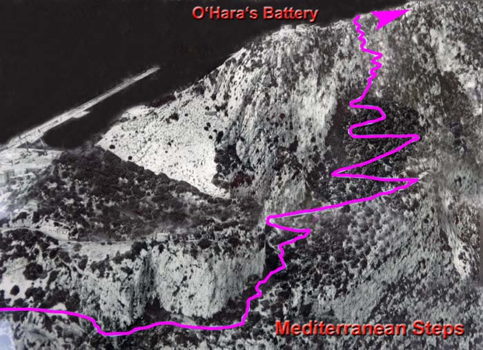 P rechts der Auffahrt zum Jews' Gate - Cemetery - Mediterranean Steps („Thrill seekers path“) durch die Ostwand auf O'Haras Battery - Gipfelkamm zur Cable Car Top Station - Charles V Wall - Royal Anglian Way - Windsor Bridge (Hängebrücke) - Rooke Battery - Jews' Gate.