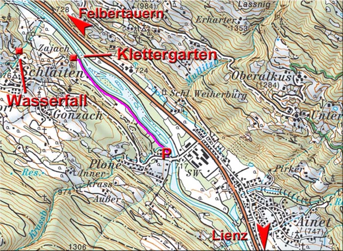P auf der Westseite der Schlaitner Brücke über die Isel (gut 1 km nw. von Ainet, 8 km nw. von Lienz) – Forststraße direkt am Flussufer (Teilstück des Iseltrails) 1,5 km gegen Nordwest, der Klettergarten liegt wenige Schritte links des Weges. Eine Zufahrt auf teils unbefestigten Wegen über Schlaiten/Mesnerweg ist umständlich und wird nicht gerne gesehen.