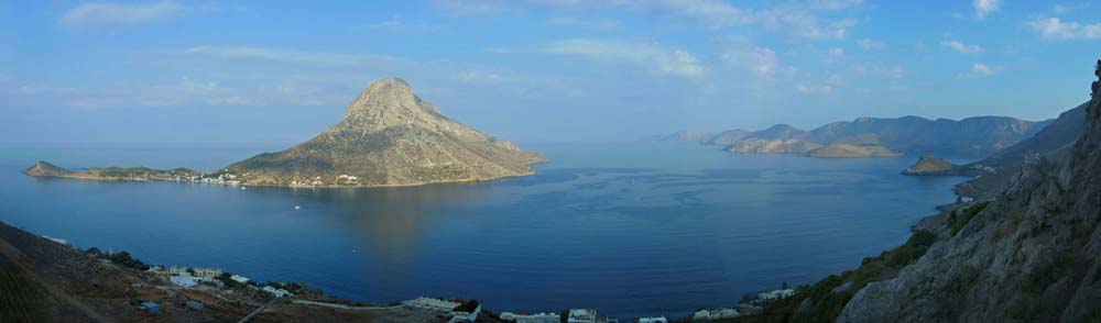 oberhalb der Terrasse unseres Studios in Myrties erhebt sich der Sektor Gerakios, durch den linken Wandteil führt die Via ferrata, ganz oben links der Mitte die AbseilhöhleBlick nach W auf die Insel Telendosdie Insel Telendos und der Norden der Insel, gesehen vom Sektor Poets oberhalb Masouri