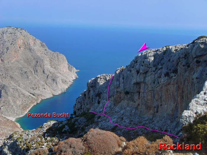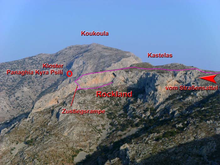 im kleinen Hafen von RinaErich in der 350 m langen Querung von Socratic Swimming Lessons 6a+ - 7a+ knapp über dem Wasserspiegel des Rinafjordesder Sektor Rockland am Kastelas vom höchsten Straßenpass der Insel (aus WNW); die Koukoula-Besteigung aus der Pezondabucht findet ihr im Archiv Bergsteigender halbstündige Zugang ist landschaftlich besonders reizvoll und lässt den Sektor meist einsam bleibenam Kastelas Nordsporn steigt man gegen die Pezondabucht ab ...... und erreicht über eine versicherte Felsrampe die Einstiegeselbst die im Führer mit nur einem Sternchen ausgezeichneten Routen sind durchaus lohnend, wie etwa GR 69 6a+in Mamas Schuhen kommt doch jeder rauf!Ulli in El Bulli 6a+Erich in El Bulli - einen Meter höher als Ulli