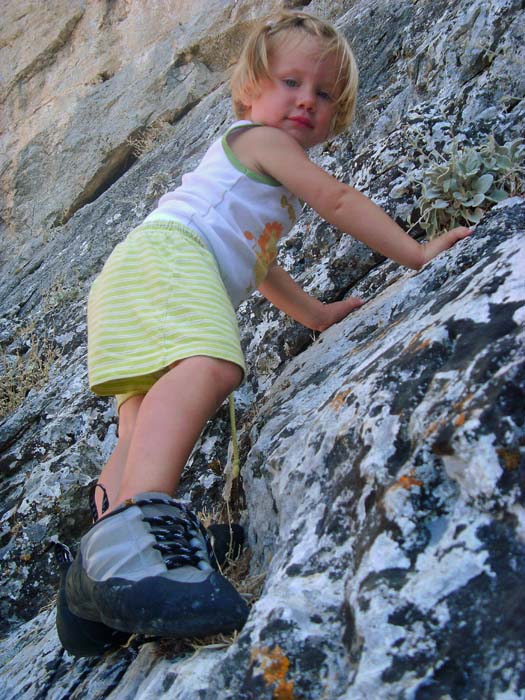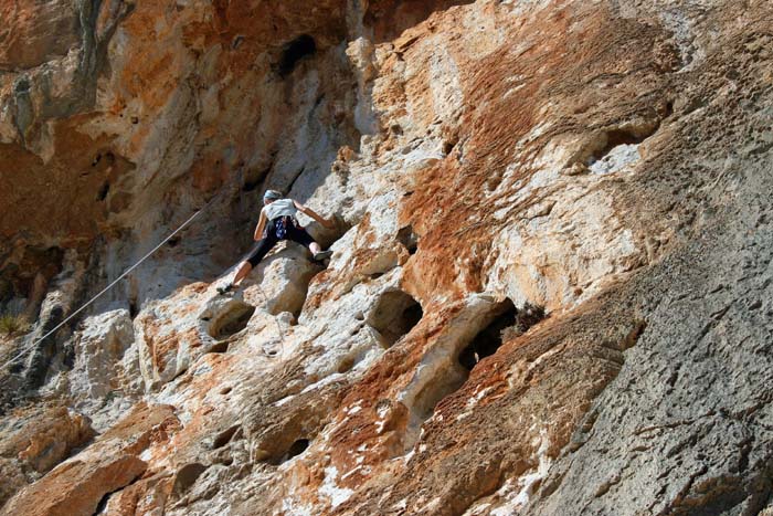 Blick über die Arginontabucht nach S; links oberhalb des Standortes der Sektor Arhi; das Wort bedeutet „Anfang“, und tatsächlich wurden hier im Jahre 1997 von italienischen Kletterern die ersten Touren der Insel eingerichtetdie riesige Halbhöhle des Troulos im Sektor Arhi mit Routen bis 9a; rechts der Mitte die fantastische Löcherreihe von Kalymnian Cheese mit drei langen Seillängen (6a+, 6b+ und 7a)aber natürlich auch jede Menge zu tun für Genusskletterer - für große (Roman in Minotauro 5c) ...... und kleine (Roniponi in Pinipon 4c)wir wechseln über den Stavrospass in den entlegenen NO der Insel; hier die Palionisosbucht mit dem gleichnamigen, neuen Sektor links obender Wandfuß des Sektor Palionisos Bay mit der runden Löcherroute ...... Iltis 6b, eingerichtet von einem deutschen Paar und dem freundlichen griechischen Ex-Lehrer Nikolas, der etwas landeinwärts eine Taverne betreibtin diesem entfernten Teil der Insel finden sich etliche weitere Juwelen, wie etwa der ebenfalls brandneue Sektor Secret Gardens oder der hier dargestellte BeachThe Beach - tolle Kletterei am meerseitigen Ausgang eines kleinen Wildwest-Canyons; viele neue Touren, die erst in der 6. Auflage des Führers publiziert werdenSpürnasen werden etwas weiter hinten noch diese zwei Routen entdecken (6b+ ...... und 5c), welche bis jetzt noch nicht einmal einen Namen haben