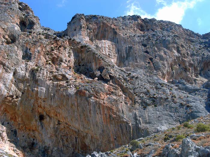Oberhalb der Westküste, gegenüber der Insel Télendos, gehen die einzelnen Sektoren beinahe nahtlos ineinander über. Oft braucht man von seinem Studio nur 15 min bergan zu steigen und man ist an Ort und Stelle. Überall toller Fels, oftmals fantastische Sinterbildungen, ganz zu schweigen von den Ausblicken aufs Meer und die Inseln. Als Highlight gilt die Grande Grotta, man findet aber auch verschwiegenere Winkel und sogar einen Klettersteig mit optionaler freier 35-m-Abseilstelle zum Drüberstreuen.