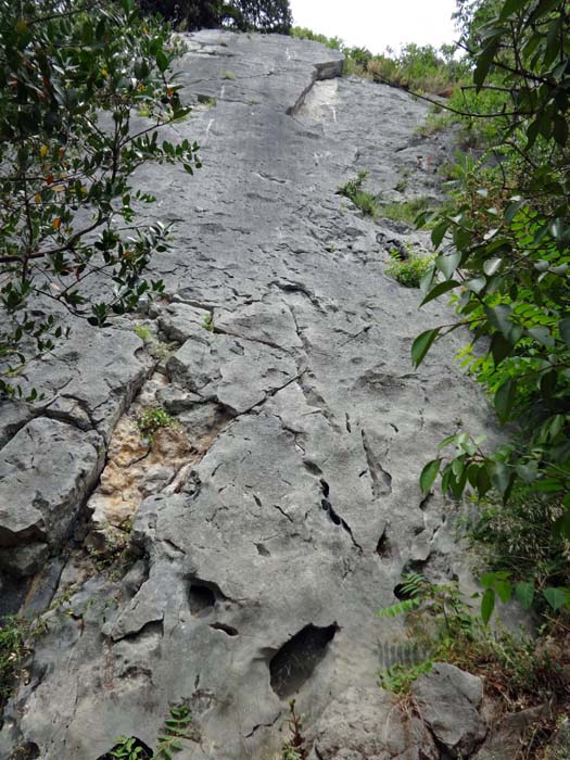 falls man auf der Autobahn aus Richtung Norden (Udine) anreist, lohnt sich der kurze Abstecher nach Doberdò del Lago: Ronja in Fessura 4anicht zu verfehlen: am auffallenden Tunnel der Küstenstraße 15 km nördlich von Triest das Gebiet Costiera. Durch den Wandstreifen links des Tunnels legte seinerzeit Emilio Comici eine 2-Seillängen-Route; wir starten einen Rundgang zum Wandfuß im Uhrzeigersinnüber einen kurzen Klettersteig gelangt man zunächst zum Sektor Costiera Nuova in der Steilwand gleich unterhalb des Parkstreifens; 10 einladende Plattenrouten (5c bis 7b, maximal 25 m hoch)gleich unterhalb führt der gut begehbare Steig zum netten Kiesstrandhält man sich oben am etwas unübersichtlichen Wandfuß weiter nach Norden, erreicht man bald den klassischen Sektor; der Einstieg zur Comici 6b, 2 SL, 60 mim Mittelteil des Classico; hier liegen leichte Routen wie Macedonia 4c nur wenige Meter neben anspruchsvollen Biestern wie Cocomo 8adem Steig weiter folgend treffen wir wieder auf einen Klettersteig, der uns schnell hinauf zum Ausstieg ...... genau 50 m nördlich des Tunnels leitet15 Sektoren zählt allein Napoleonica, die Ausblicke erinnern an Monaco; hier der entsetzlich steile Scudo, wo man sich die Krallen zwischen 7a und 8b schärfen kann. Keine Angst um die Mädels - allgemeines Fahrverbotin den unteren Stockwerken geht's viel ruhiger zu als oben an der Straße; im Sektor Parallele klettert Ulli den Genussklassiker Fessura 5anoch ein Blick von der Vedetta, dem „Gipfel“ von Napoleonica, gegen Westen: Schloss Miramar bei Sonnenuntergangoben auf der Karsthochfläche hinter dem Ort Aurisina versteckt sich ...... die Grotta Caterina, ein selbst im Hochsommer kühles Sinterparadies für Extreme, in welchem erst seit 2011 geklettert wirdauf dem Dorfplatz von Bagnoli, am Eingang zum Val Rosandra; über den Dächern bereits die ersten Sektoren: ...... Canarini (24 Routen 5a - 7c+) und ...... Giardini d'Inverno; in den gemütlichen „Wintergärten“ gibt's auch etliche Einsteigerrouten ab 3cdas Val Rosandra erstreckt sich bis hinauf zur slowenischen Grenze; am Wandfuß des Sektors Piccolo Ferrovia (links) ...... führt die Trasse der ehemaligen Schmalspurbahn weit ins Tal hinein, die heute als Radweg und als Zustieg ...... zum Sektor Vergini dient; Ronja in der 1. SL von Topolino coraggioso 5a