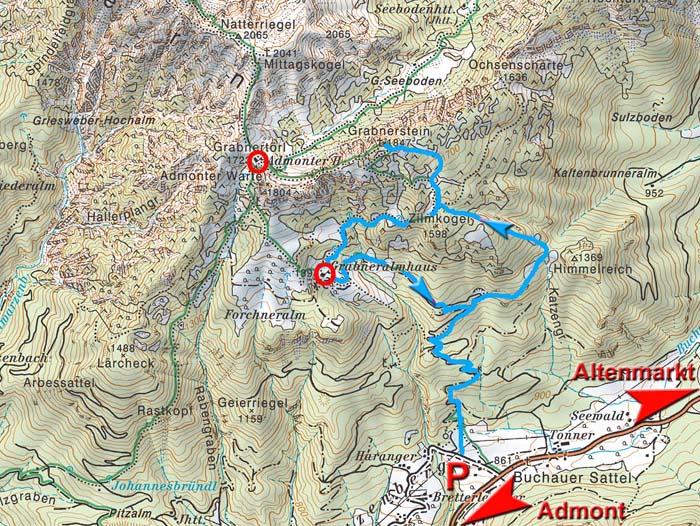 P Kletzenberger Straße knapp westl. des Buchauer Sattels, 8 km nö. von Admont, knapp 15 km sw. von St. Gallen - nördl. auf Forstweg in Richtung Grabneralm. Mehrere Aufstiegsvarianten, wir begehen die östliche Spur in den Katzengrabensattel - Zilmkogel - SO-Flanke Grabnerstein. - Abfahrt vom Zilmkogel westwärts in meist zügiger Fahrt querend zum Grabneralmhaus - Forststraße zum P.