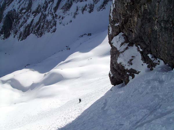 Vor dem Auslauf der Schafplan entschließen wir uns noch für die eindrucksvolle Westflanke des Langstein, die in einer Stunde perfekt aufgefirnt sein müsste. Hier finden wir auch die beste Übersicht auf die heutige Runde – und einen herrlichen Tiefblick auf ein weiteres verstecktes Juwel, das Schlapfenkar unterm Hochturm, der wohl wildesten Felsgestalt in den Haller Mauern.