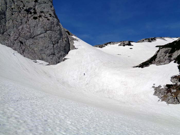 Die Dietlhölle ist die bekannteste und eine der zahmsten der insgesamt zehn teilweise sehr anspruchsvollen Stoderkamm-Abfahrten. Die meisten Tourengeher geben sich mit dem Erreichen der Dietlbüheln zufrieden. Die Krönung des Unternehmens ist allerdings die Besteigung des Feuertalberg, eines burgartigen Felskolosses, der die arktische Traumlandschaft des Zentralplateaus noch um mehrere Hundert Höhenmeter überragt. Die Kondition wird dabei auf die Probe gestellt - zu den bereits absolvierten 1350 Hm kommen 410 weitere -, alpine Erfahrung sind am Feuertalberg ebenfalls gefragt, mehr als an den benachbarten Hochkästen. Die Südostflanke wird nach oben hin sehr steil, der Durchschlupf vor der schönen Gipfelkalotte erfordert etwas Kletterei. Bleibt man am felsigen Grat, dann sollte man sich vor den oft weit auskragenden Wechten hüten; am obersten Grataufschwung wird's dann ebenfalls steil und leicht bröcklig, ausrutschen sollte man auf keinen Fall. Der Lohn am Gipfel ist allerdings süß, von kaum einem anderen Berg wird man die beeindruckenden Ausmaße des Toten Gebirges und seiner Nachbarn besser erfassen.