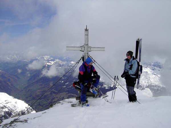 Der aussichtsreiche Anstieg über die Ritterkaralm, das Steinkarl und den breiten Ostgrat ist weniger steil als erwartet. Vor uns stürmt bereits ein Alleingänger mit Stirnlampe über die endlosen Hänge hinauf, fährt aber schon von der Ostschulter, 2786 m, wieder ab. Die restlichen 220 Hm am schmalen Gipfelgrat sind nicht gespurt. Wir tragen hier die Schi; Werner, ein freundlicher Schwarzacher, schließt sich uns bis zum Gipfelkreuz an.