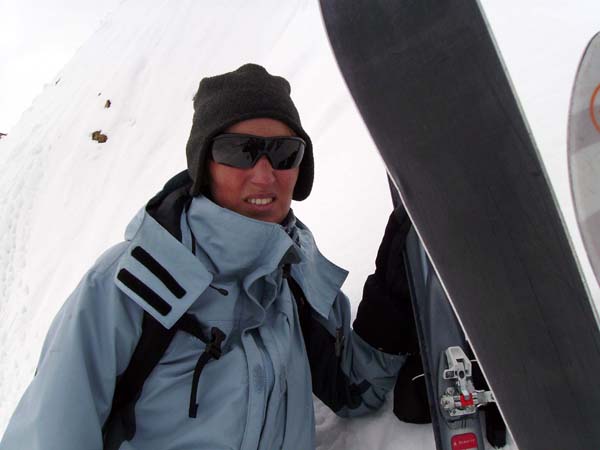 Fantastische Rundsicht, die höheren Gipfel immer wieder in fotogenen Wolken, ein Traumtag. Wir trennen uns von Werner und jubeln die Goldlacklschneid gegen den Hocharn hinunter. Wir sind früh dran und werden mit perfekten Verhältnissen belohnt. Die 10 cm Neuschnee stören nicht, lediglich die Traversierung der drei felsigen Gratköpfe ist wirklich steil. Bald stehen wir am Beginn des horizontalen Reitgrats, schon auf Höhe der Scharte. Nur mehr ca. 20 m trennen uns von den obersten Schneezungen des Gamskares, eine steile Plattenwand zwar, aber reichlich mit Henkeln und Leisten versehen. Zuversichtlich schmeißt Erich in hohem Bogen Schistöcke und Steigeisen runter ins Kar …