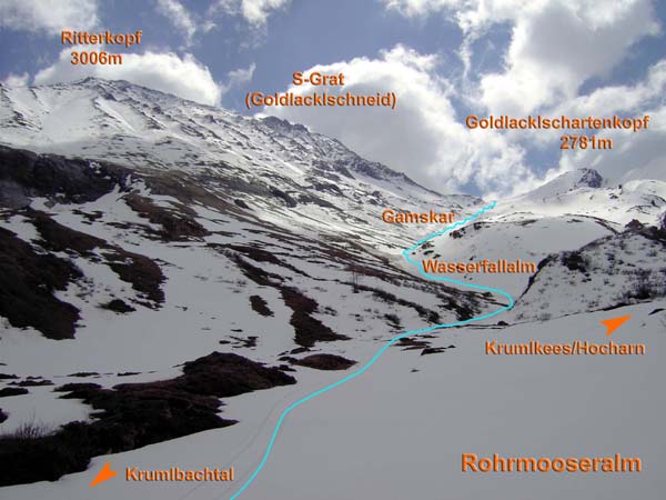 W.H. Bodenhaus, Rauriser Tal – Ritterkaralm – O-Grat – S-Grat (Goldlacklschneid) - ??? – Gamskar – Rohrmoosalm – Bräuhütte – Krumlbachtal – G.H. Lechnerhäusl – W.H. Bodenhaus.