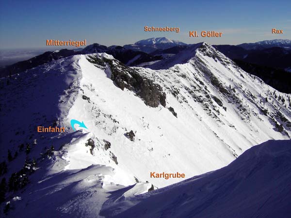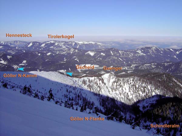 Oberknollenhals, Gscheid, B21 7 km westl. von Kernhof – NW-Kamm Gsenger – Ü Göller – Ü Mitterriegel (Hochwaldriegel), dem westl. Vorgipfel des Kl. Göller – Abfahrt Karlgrube bis zur Forststraße auf 1200 m – Wiederaufstieg SSO-Kamm (Lußterriegel) auf den Göller – Ü Terzer Göller – NNW-Kamm und Hühnerkralle-Variante in den Andregraben – Göllergraben – P.