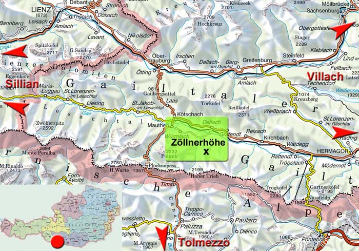 P Gratzhof, 1 km sö. oberhalb von Weidenburg, 7 km sö. von Kötschach-Mauthen – Forststraße Gratzer Alm – Eggilealm – NO-Mulde Zöllnerhöhe. - Bei der Abfahrt am oberen Teil der Forststraße einige steile Abkürzer möglich.