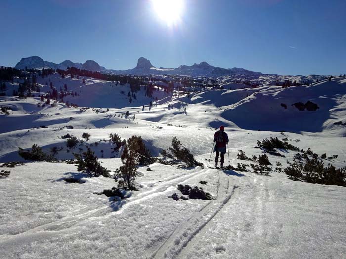 Am dritten Tag unserer großen Dachstein-Transversale glauben wir zu wissen, worauf wir uns einlassen. Und doch hält der lange Übergang zur Hofpürglhütte so manche Überraschung bereit: Einerseits übertrifft die andauernde, unmittelbare Nähe der gewaltigen Dachstein-Südwände und der Zacken des Gosaustein bis hinüber zur Bischofsmütze noch alle hochgeschraubten Erwartungen. Die eingestreuten Zwischenabfahrten – etwa vom Tor ins Rauchkar und von der Sulzenschneid ins Eiskar sind wirklich hübsch und gestalten die zwölf Kilometer Luftlinie höchst abwechslungsreich. Auch in technischer Hinsicht kann – je nach den herrschenden Verhältnissen – die „leichte und schöne Schiwanderung“ (Rabeder-Brüder in ihrem längst vergriffenen Schiführer Dachsteingebirge, 1979) mit unerwarteten Aufgabenstellungen punkten. Schon zu Beginn können pickelhart gefrorene Hangquerungen zur Südwandhütte und die kurze, steile Abfahrt ins Auretskar erhöhte Aufmerksamkeit einfordern, bis uns drüben am Marboden endlich die Sonne erreicht. Auch die Einfahrt von der Sulzenschneid ins Eiskar ist ziemlich steil. Drüben am Linzer Weg, das Ziel schon vor Augen, wartet dann noch ein kurzer Steilaufstieg mit der manchmal lustig überwechteten „Roten Rinne“ auf Überlistung. Hier sollte man sich nicht verleiten lassen, zur Vermeidung der anstehenden 150 Hm die direkte Linie unterhalb der Kesselwand zu wählen.
