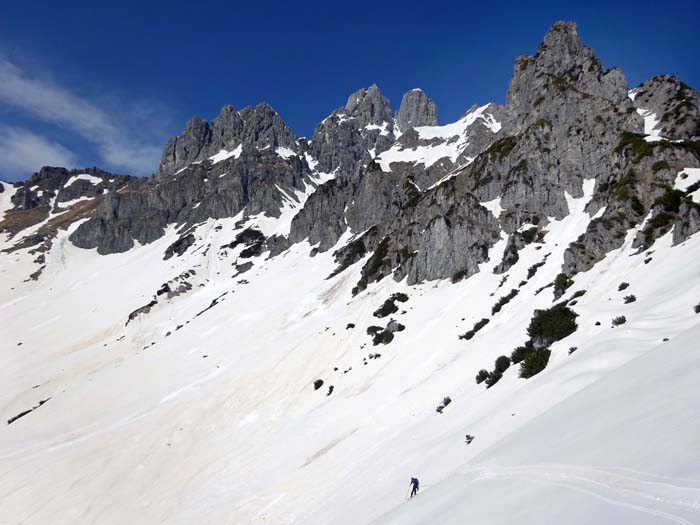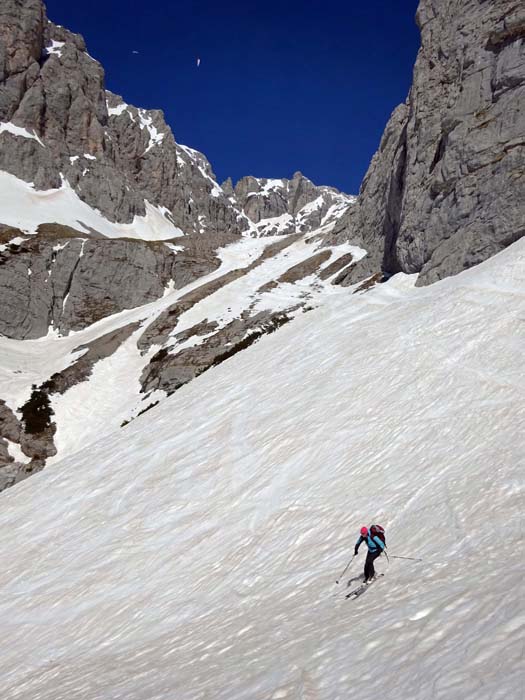 Nach der Überquerung des südöstlichen Teils des Toten Gebirges stehen wir nun in Bad Mitterndorf im Steirischen Salzkammergut vor einem weiteren gigantischen Karstareal. Für eine möglichst direkte Transversale überschreiten wir zunächst die ausgedehnte Hochfläche Auf dem Stein, wo sich in weiterer Folge zwei Linien zur Hofpürglhütte anbieten: die Nordroute über den höchsten Punkt, den Hohen Dachstein bzw. die Steinerscharte, die Adamekhütte und das Windlegerkar (wird später ergänzt); oder die Abfahrt durchs berühmte Edelgrieß zur Türlwandhütte mit Querung entlang der kilometerlangen Fluchten der beeindruckenden Dachsteinsüdwände. Zwei Wege, die unterschiedlicher nicht sein könnten, die man aufgrund ihrer Großartigkeit eigentlich beide gemacht haben muss. Dabei sollten sich auch Tourengeher mit überdurchschnittlicher Kondition mindestens drei Tage gönnen. Mit weniger Zeitaufwand wird man im besten Fall sportlichen Ehrgeiz befriedigen, aber nicht annähernd den landschaftlichen Höhepunkten gerecht werden. Zudem macht es rein genusstechnisch gesehen keinen Sinn, in den Morgenstunden das traumhafte Edelgrieß abzufahren, bevor es aufgefirnt hat. Unser Zeitplan – Abmarsch fahrplanbedingt erst nach halb acht und Biwak nicht zu nah am Koppenkar – hat sich als durchaus praktikabel erwiesen.