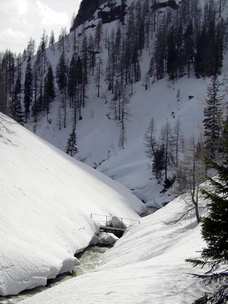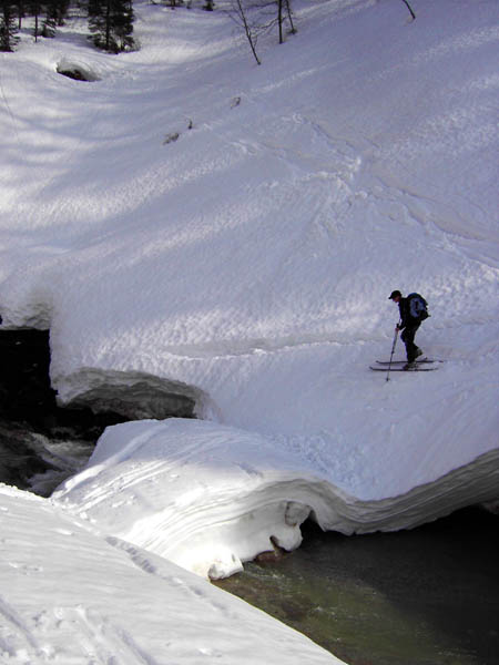 Die Wegsuche entlang oder hoch über dem reißenden Fluss kann viel Flexibilität erfordern, der Steg übers wilde Wasser ist nicht leicht zu erreichen, wir überwinden die Barriere 200 m vorher auf einer Schneebrücke, die schon aus dem letzten Loch pfeift. Wer ins eiskalte Wasser rutscht, hat keine guten Karten mehr. Auch der folgende 300-m-Gegenaufstieg durch den Natterngraben in den versteckten Sattel hinterm Gamsofen ist vor Abgang der großen Lawine nicht wirklich berechenbar. Alles in allem kann dieser Waldabschnitt technisch gesehen wesentlich heikler sein als alles, was am Zentralplateau gefordert ist. Für heute reicht’s uns – der einladende, apere Windkolk an der Südseite des ersten Häusels der Interhüttenalm lässt uns nicht mehr vorbei. Ulli findet zu allem Überfluss unter der Hütte eine dicke Pressspanplatte, die uns als ebene, trockene Schlafplattform gute Dienste leisten wird.