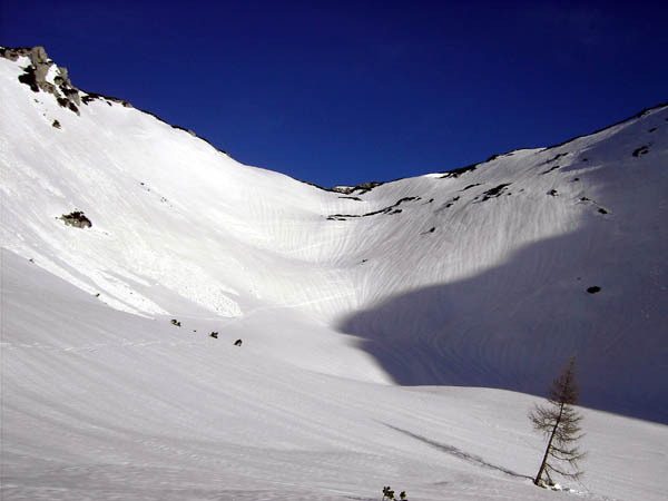 Um Höhenmeter zu sparen, haben wir ursprünglich vorgehabt, dem Graben des Hintersteinerbaches hinauf zum Gscheidriedel zu folgen, um beim Eisernen Bergl auf die bequeme Wintermarkierung zu treffen. Der verlockenden Spur zum Hochanger, dem südöstlichsten 2000er des Toten Gebirges, konnten wir dann doch nicht widerstehen. Wir haben diesen schöner Auftakt für die große Linie nicht bereut. Lediglich das Gelände zwischen Angerkogel und Löckerböden entpuppt sich als ziemlich knifflig, wahrscheinlich besser zum Angerersattel abfahren und sich dann die Wintermarkierung suchen.