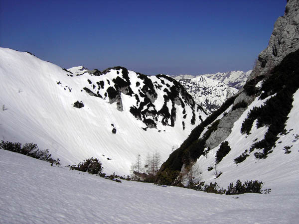Erstaunlich früh stehen wir unter der steilen Gipfelflanke des Wehrkogel, der steilen Ostschulter des Schönberg (Wildenkogel, höchster Gipfel des westlichen Toten Gebirges); deshalb trauen wir uns noch zu Fuß in gerader Linie den südseitigen Steilhang hinauf. Ist man später dran, sollte man den Berg nordseitig umgehen (was nebenbei ca. 100 Hm einspart). Uns liegt so aber das gesamte Feuertal mit seiner Fortsetzung, dem Kessel zwischen Vorderen (lt. AV-Karte oder Hinteren lt. ÖK?) Rauhenkogel und Möselhorn zu Füßen - fast 700 Hm berauschende Abfahrt. Es geht langsam dem Ende zu, trotzdem kann man sich gerade hier unten, im Bereich der Nestlerjagdhütte, als Ortsunkundiger mehr verhauen als sonst wo auf der Überschreitung. Haltet euch genau an die eingezeichnete Route, d. h. so hoch wie möglich den Auslauf des Möselhorn-Nordspornes nach W queren auf den schmalen, ebenen Boden knapp südlich des kaum sichtbaren Jagdhauses. Dann aus der tiefsten Stelle des Bodens keinesfalls die verlockende Rinne Richtung Karkogel hinauf (die beiden in der ÖK angedeuteten Steilrampen Richtung Predigtkogel sind äußerst steil und absturzgefährlich! Verbringt man hier alljährlich seinen Urlaub oder hat man die AV-Karte zur Hand, kommt man ohnehin nicht auf die Idee, dort oben herumzusuchen). Sondern: Im Bereich des meist noch tief verschneiten Jagdsteiges die einzige Schwachstelle der bis zu 100 m hohen Wandstufe westl. hinunter finden. Man gelangt so in eine versteckte, aber gut begehbare Rinne noch oberhalb der hämisch heraufgrinsenden Nestlergrube, in die man Gott sei Dank nicht mehr abfahren muss. Das Ganze ist dicht bewaldet, von kaum überwindbaren Felswänden durchsetzt und unübersichtlich, nur manchmal erhält man kurz Durchblick auf die jenseitige Schwachstelle der Langwand (200 m nnw. des Langwandgupf) und wünscht sich dort hinüber. Wenn man’s weiß keine Hexerei, wenn man aber herumsuchen muss, wird einem schnell klar, dass die nächste Verkehrsanbindung noch relativ weit entfernt ist.