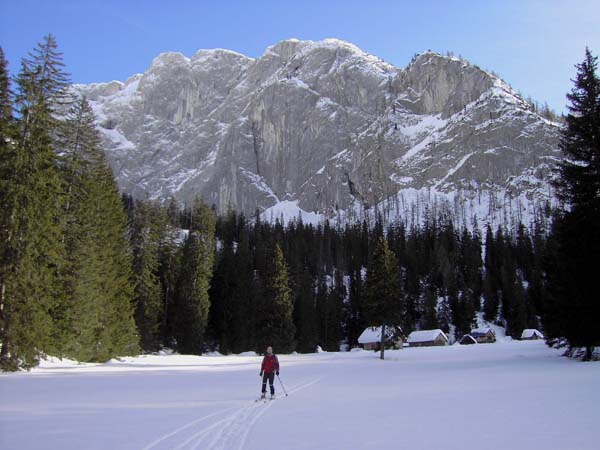 Den Schizirkus umgehen wir allerdings weiträumig. Nicht der längste Sessellift Europas transportiert uns bergwärts, die eigenen Beine bringen uns hinauf, und zwar vom Ortsteil Tauplitz/Greith gleich direkt zu den Steirerseehütten. Schon hier verstehen wir, warum sich auch die Alten schon unbedingt Bretter an die Füße schnallen mussten – drei gegensätzliche Geländeformen, welche harmonisch ineinander verschmelzen: die perfekten Schihänge der Steirerseeleiten, die einladenden Steilflanken von Traweng und Steirertörl, überragt vom Dolomitenkletterspitz des Sturzhahn. Eine halbe Stunde später haben wir eine Gruppe von etwa zwei Dutzend Tourengehern eingeholt, mitten unter der Woche. Hier, wo sich das Gelände nachhaltig verflacht, gibt’s eine Abkürzung zum Kleinen Tragl hinauf, allerdings gegen 50° steil, unterm Schnee liegt das Himmelreich begraben, eine Genussklettertour im vierten Schwierigkeitsgrad (weitere Informationen und Bilder dazu auf der Homepage von Martina und Peter, siehe auch unter Literatur).