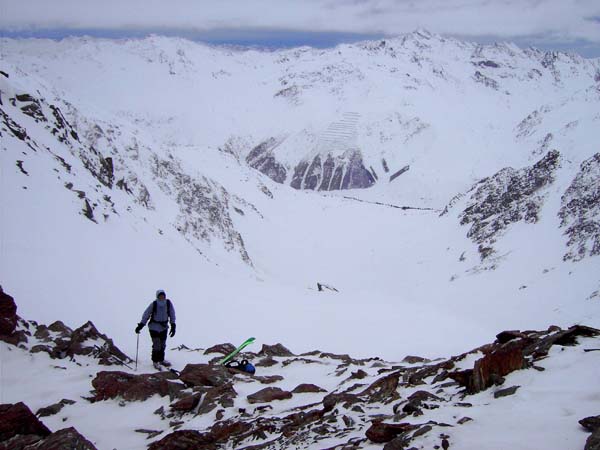 Abfahrt vom Schidepot durch die N-Flanke ins Valbenairtal und über die Piste zum P.