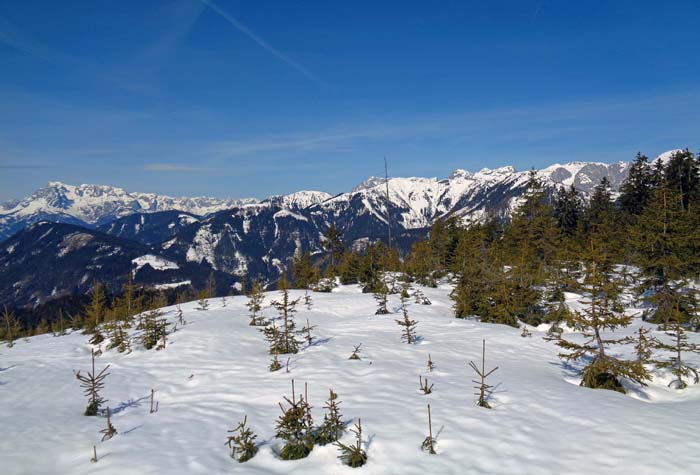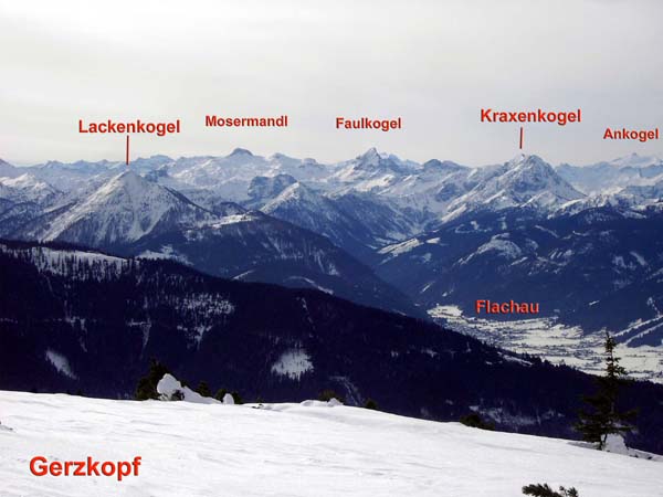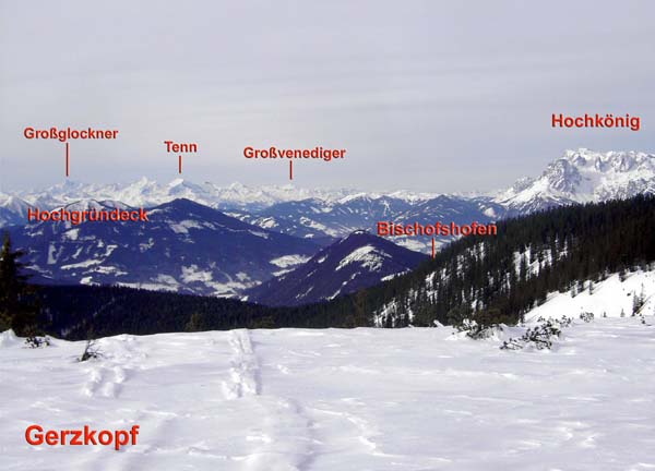 Zehn Jahre nach der ersten Bekanntschaft mit dem Gerzkopf (s. unten) kommen wir auf unserer Schiüberquerung vom Wienerwald nach Osttirol erneut hier vorbei. Zusammen mit der folgenden Blümeck-Hochgründeck-Überschreitung nach Wagrain absolvieren wir somit zwischen den Hochgebirgsszenerien von Dachstein und Radstädter Tauern die zwei letzten, kaum begangenen Waldetappen der langen Spur - gekrönt allerdings durch großartige Aussichtsberge, ähnlich dem Dürrenschöberl zwischen Eisenerzer Alpen und Totem Gebirge.