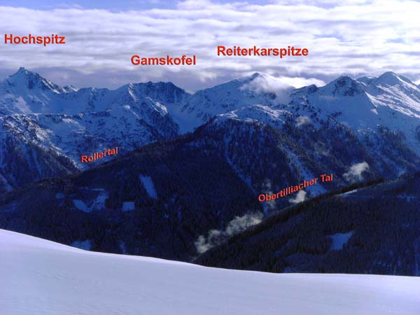 P Prünsterhof, Leiten, B111 gut 3 km westl. Obertilliach - Forststraße Klammbachgraben - S- oder SO-Flanke Dorfberg - Ü Pfannegg - Ü Golzentipp SW- und Hauptgipfel. - Alle 3 Abfahrtsmöglichkeiten enden in Obertilliach: