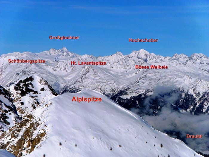 Eine ideale Kombination einer Panorama-Kammwanderung erster Klasse mit einer spannenden Abfahrt ins denkmalgeschützte Haufendorf Obertilliach. Die drei Kilometer Luftlinie dieser alpinen Milchstraße lassen sich leicht auf zehn ausdehnen. Dazu startet man in St. Oswald, hoch über Sillian (eventuell mit Sesselliftbenützung, 450 Hm) und gelangt über den lang gezogenen Oberberg und die Ochsenwiese von W auf den Dorfberg. Der schönste Teil folgt jetzt: unfassbare Aussicht von den Dolomiten über den Großglockner bis zum Ankogel und zur Hochalmspitze. Die ruhigen, weiten Flächen in Weiß werden unterstrichen von den inselartigen Farbklecksen der hier noch exotisch wirkenden Wandformationen von Spitzenstein und Breitenstein - den Vorboten der pittoresken Lienzer Dolomiten.