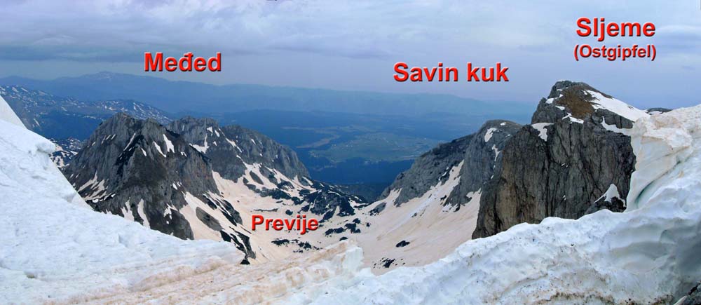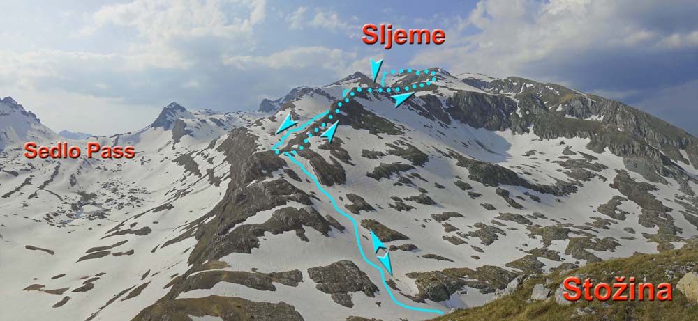 P Prošćenski Katun (=Alm), ca. 8 km ssw. von Žabljak - Sedlostraße (unter Schnee) - SO-Grat auf die Stožina (I) - Abfahrt in den Sattel nw. des Gipfels - S-Grat Jablan bara, 2247 m (Kletterei bis II) - Ü SO-Kamm zum Sljeme W-Gipfel, 2441 m - Abfahrt S-Hang/S-Rinne ins Gr. Lomnidokar - oberhalb der letzten Steilstufe über der Sedlo-Straße auf breiter Schrofenrampe nach SO ansteigend zurück in den Stožina-NW-Sattel - Abfahrt gegen SO auf die Sedlostraße (wie Anstieg).